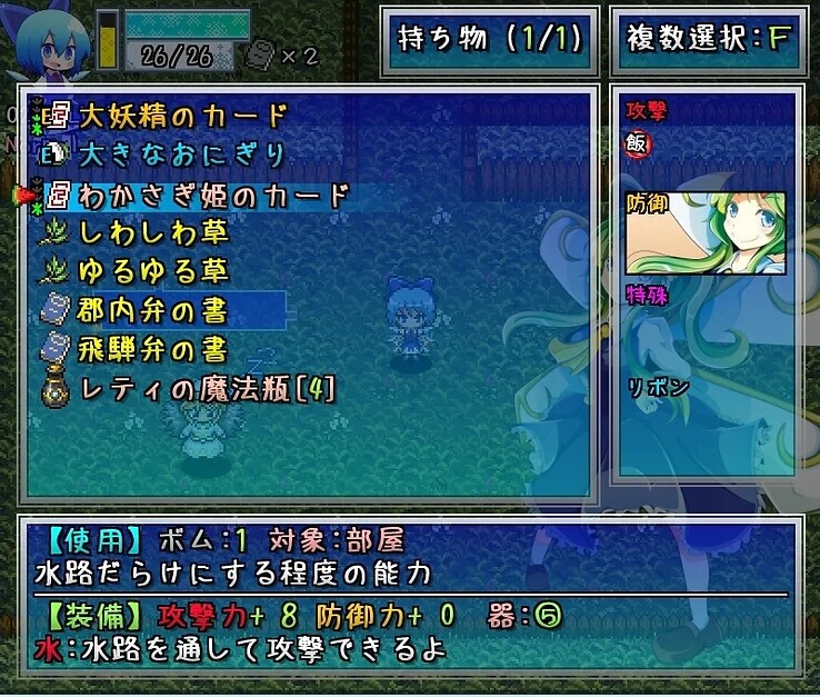 不思議の大冒険系ローグライク「チルノ見参1」が正統進化して帰ってきた!基本システムは引き継ぎつつ、無理のない改変を加えて戻ってきた!ほとんどのアイテムが上方修正! 効果が強く楽しくなった!ほとんどのエネミーも上方修正! 全然簡単になってない!紅魔郷から輝城針まで win版のキャラがほぼ全員登場!クロスロッジの集大成、チルノ見参2!チルノをうまく操作して、鬼人正邪にさらわれた大妖精を助けに行こう!◆◆倒されても完全再現できるコンテニューシステムもあるし、難易度も「+0」「+1」「+2」と3つから選べるから上級者も満足、初心者でも安心だね体験版もあるから触れてみてから購入するのいいかも?図鑑システムも導入されてやり込み要素も入ったよ