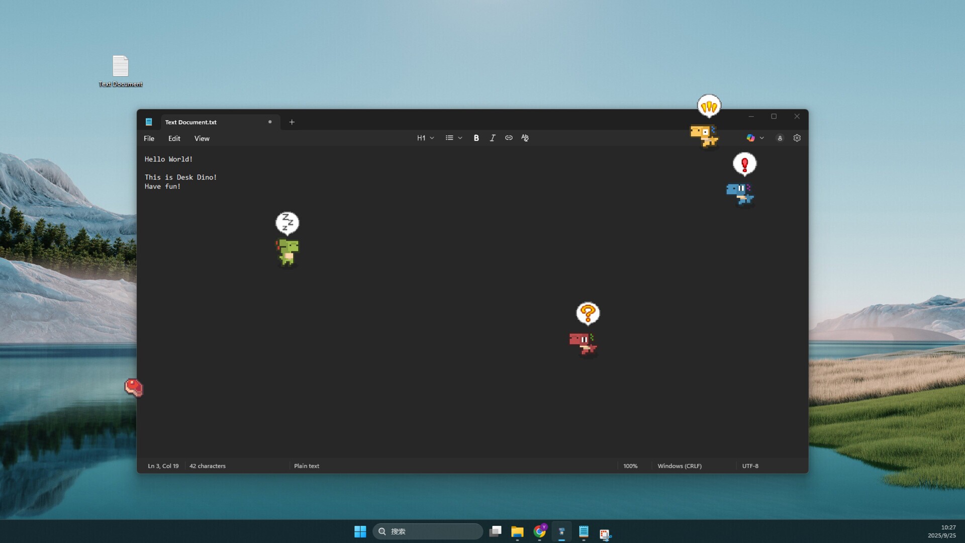 Some naughty pixel dinos run around on your computer desktop, being some good accompany while you're working, studying or relaxing. Feed them or play with them, it's on your mark. Don't worry, they won't bite. Enjoy your lovely dino.