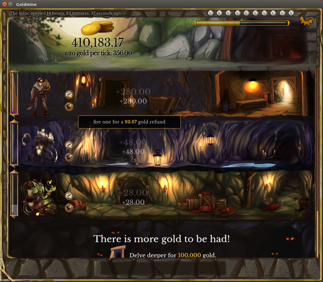This is a game I wrote so that I could have a bit of a distraction at work. The idea is simple, you click to mine a resource, hire workers to do the mining for you, upgrade them, unlock new levels and worker types, gain prestige levels and start over. I used to switch to it about every hour or so, distribute the gold and return back to work.