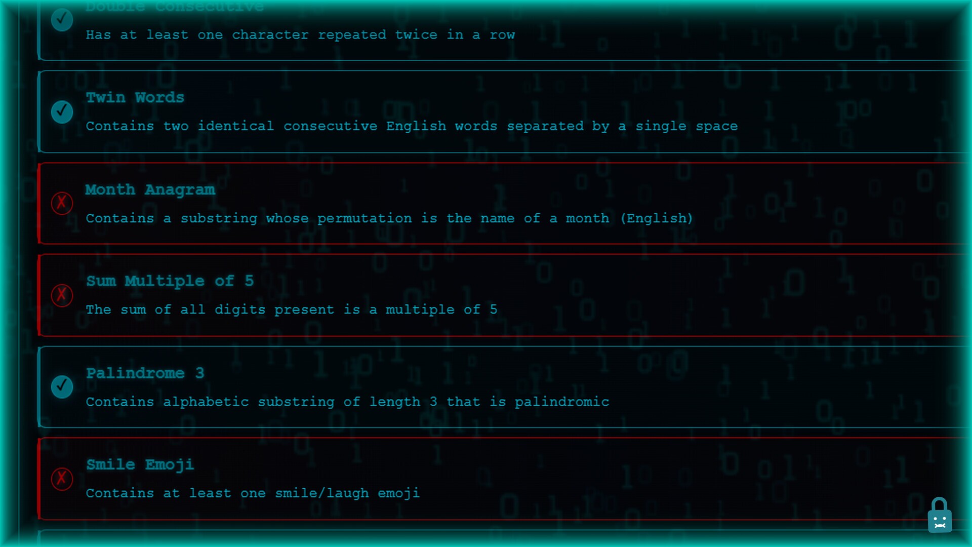 The AIs seem a little too eager for you to keep playing.Somehow, the human tester survived the chaos long enough to release it.🧠 Your MissionSolve 40 unique password puzzles that grow increasingly diabolicalUncover the logic hidden behind every rulePiece together subtle clues that reveal a deeper mysteryEarn the right to create your own rule after finishing the game — permanently expanding it for everyone else⚔️ The Final QuestionCan you outsmart four AIs and one exhausted developer?
