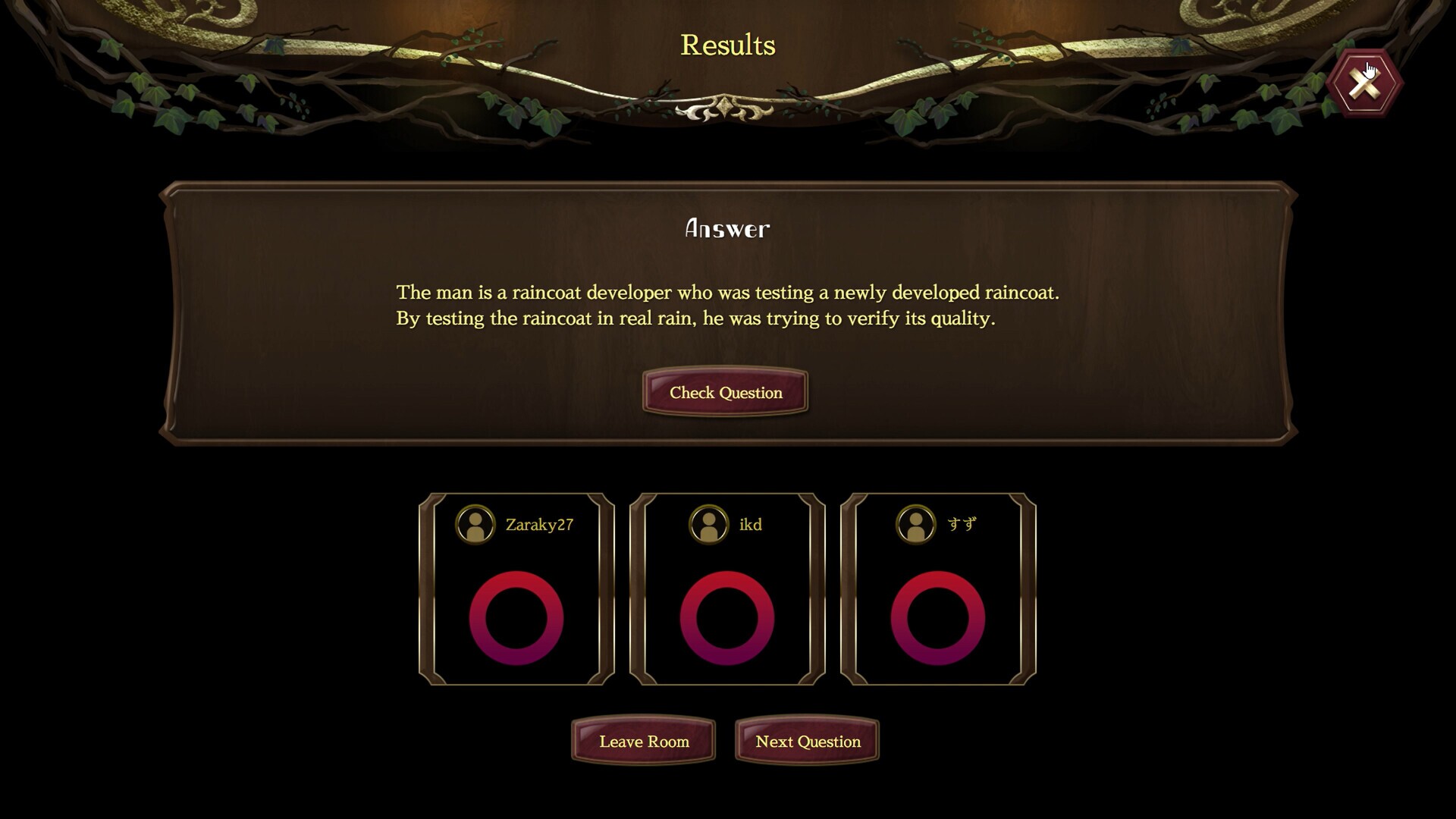 The player who creates the room becomes the host and can assign the role of the questioner to either a player or an AI.Players who join the room can choose to play as the questioner or as solvers.2. Select a Problem and Set the RulesPlayers can choose a problem from the problem set to start the game.Additionally, you can set the answering time limit, lives (answer attempts), and the number of players required to win.3. Ask Questions and Provide AnswersPlayers can individually ask questions, and the content of these questions will be visible to all players.Once a player figures out the answer, they can submit their response individually.When the number of winners reaches the set goal, or when all players have submitted their answers, the game moves on to the next problem.OverviewPrivate Sessions: Only players with the room information can join. Enjoy a private experience with friends or acquaintances. You can choose the questioner to be either an AI or a player.Customizable Game Settings: Adjust the challenge level by freely setting time limits and selecting problems.