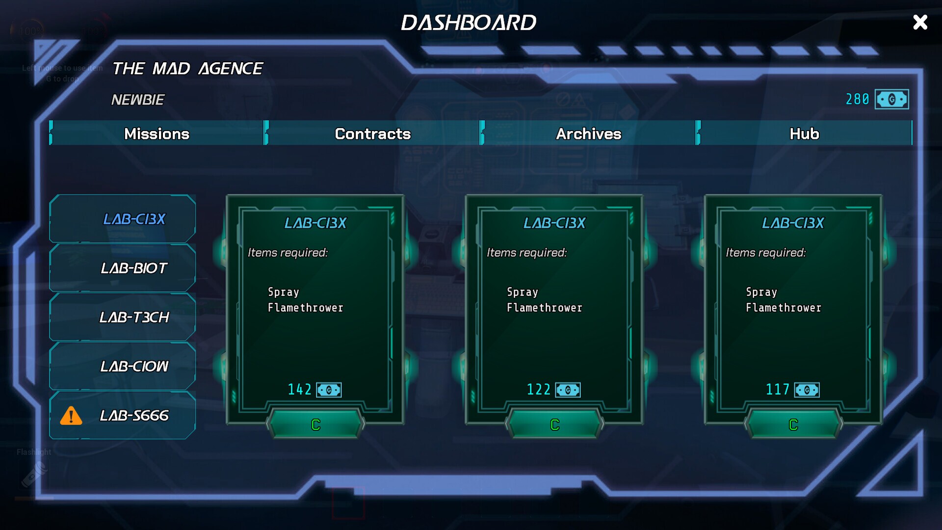 You and your friends play as a team of extreme cleaners mysteriously hired by an unknown company to erase the traces of failed experiments in their laboratories.Equip yourselves and earn money by completing missions without being spotted by the dangerous monsters in the laboratories.Progress to unlock new maps, new equipment that is as useful as it is silly, and skins.Be careful not to get into debt, or the company won't be happy...There are several types of laboratories.Each laboratory has its own theme, missions, traps, and monsters, offering a completely different gaming experience from one laboratory to another.Each laboratory is procedurally generated, allowing for constant replayability.In the laboratory selection menu, you can choose between several difficulty levels, with each level adding a new mission and potentially changing the environment.Contracts are optional secondary objectives that can be completed alongside the main mission.The objectives and rewards offered by contracts are often completely offbeat and fun, such as ridiculous skins or unique items, and will add a little spice to your adventures.