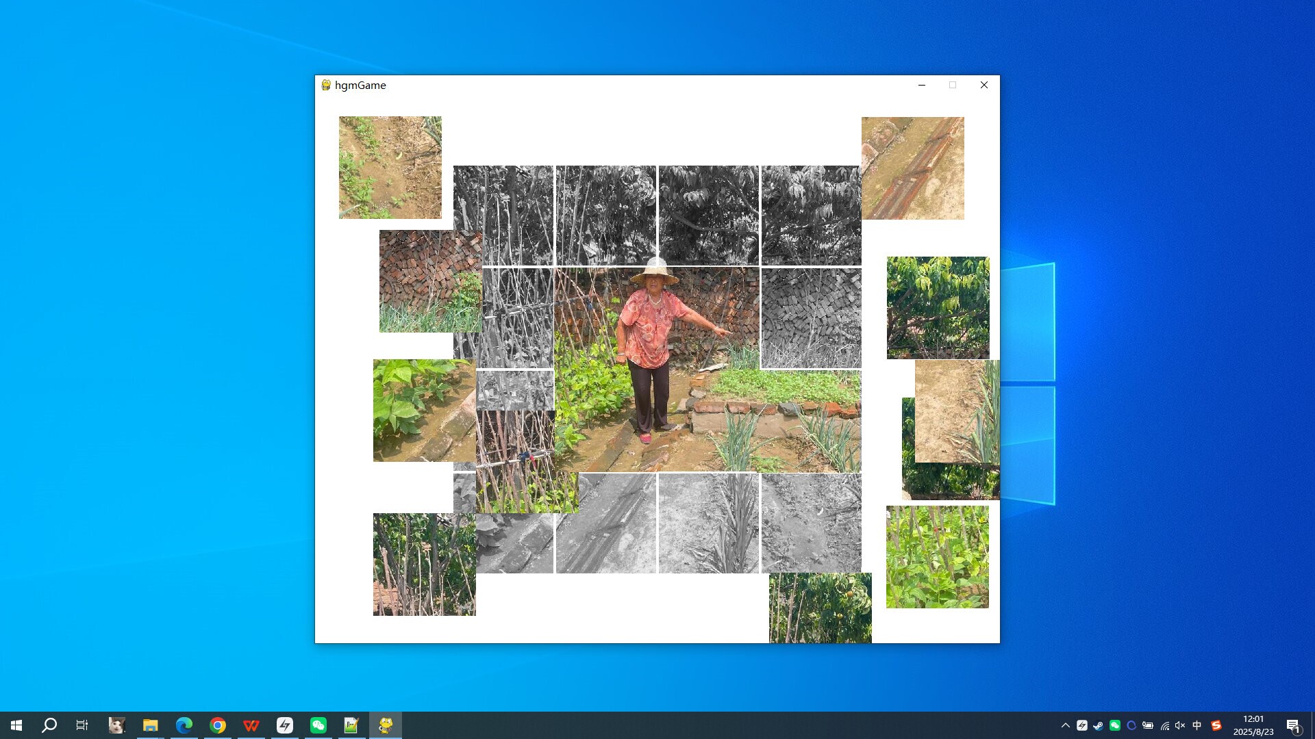 This is a casual puzzle game, with game graphics consisting of:A warm moment of an old lady in her vibrant little vegetable garden. As the absolute focus of the scene, she is wearing a wide brimmed straw hat, a red short sleeved shirt decorated with pink and white patterns, dark pants, and a pair of pink shoes, with a kind and joyful smile. She was extending her arm and pointing towards the crop on the right side of the screen, as if proudly showcasing her labor or sharing the joy of planting with others. The background of the picture is a low wall made of irregular red bricks, with lush trees visible behind the wall. The branches are covered with green fruits, possibly peaches or plums. On the left side of the vegetable garden, on which vines climb, showcasing the wisdom of rural life.Game starts:Click on 'Start Game', the image will be grayed out, and the colored parts will be randomly scrambled into 16 small fragments, scattered randomly on the screenGame process:Players click on the small image, drag it to its original position to restore it, until all the small fragments move to the correct position, and the game endsEnd or start the next game:All the small fragments are moved to the correct position, and the game ends. At this point, click "Do it again" to repeat the game