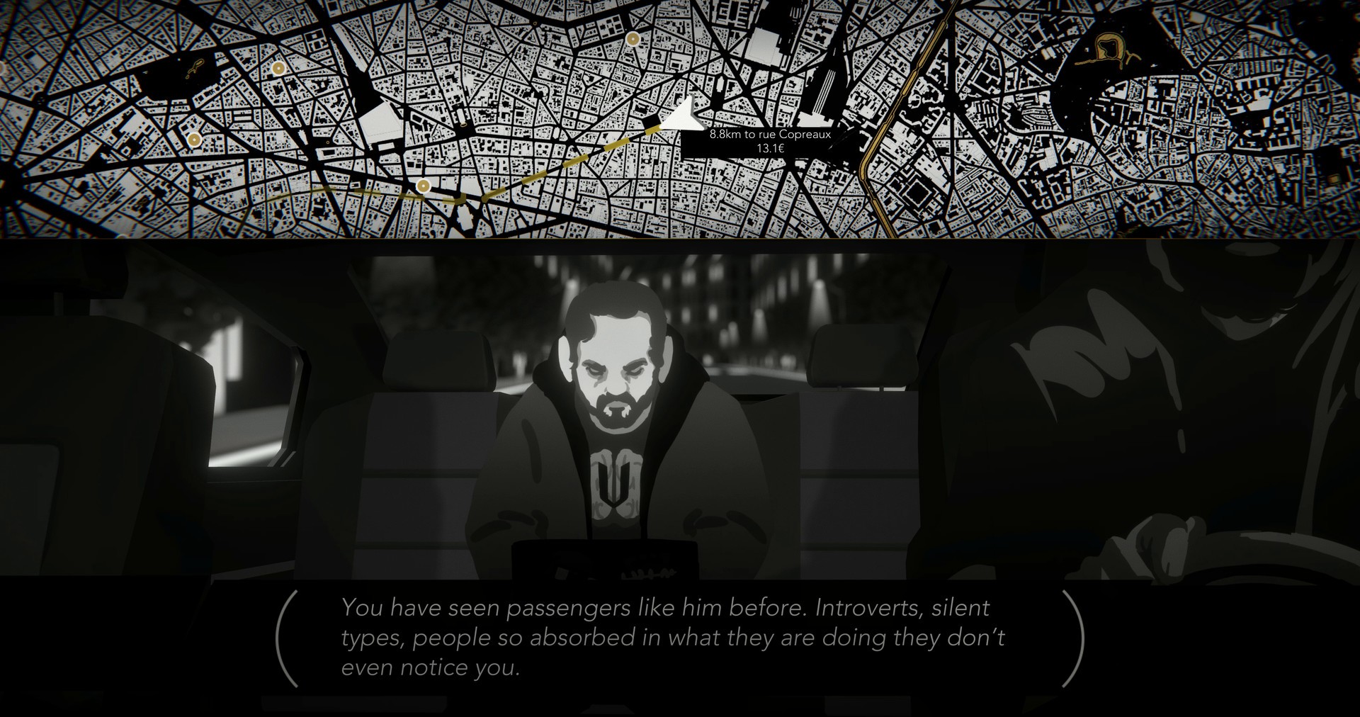 Night Call is an investigative noire game with two goals: solve a murder mystery and make enough money to pay your bills. Your shift starts at night and ends at daybreak, as you try to earn enough to pay for your cab, your apartment, and just make a living. But when the police investigation gets nowhere, the officer in charge forces you to help by doing what you do best: getting passengers to talk in the little time that you have their attention.