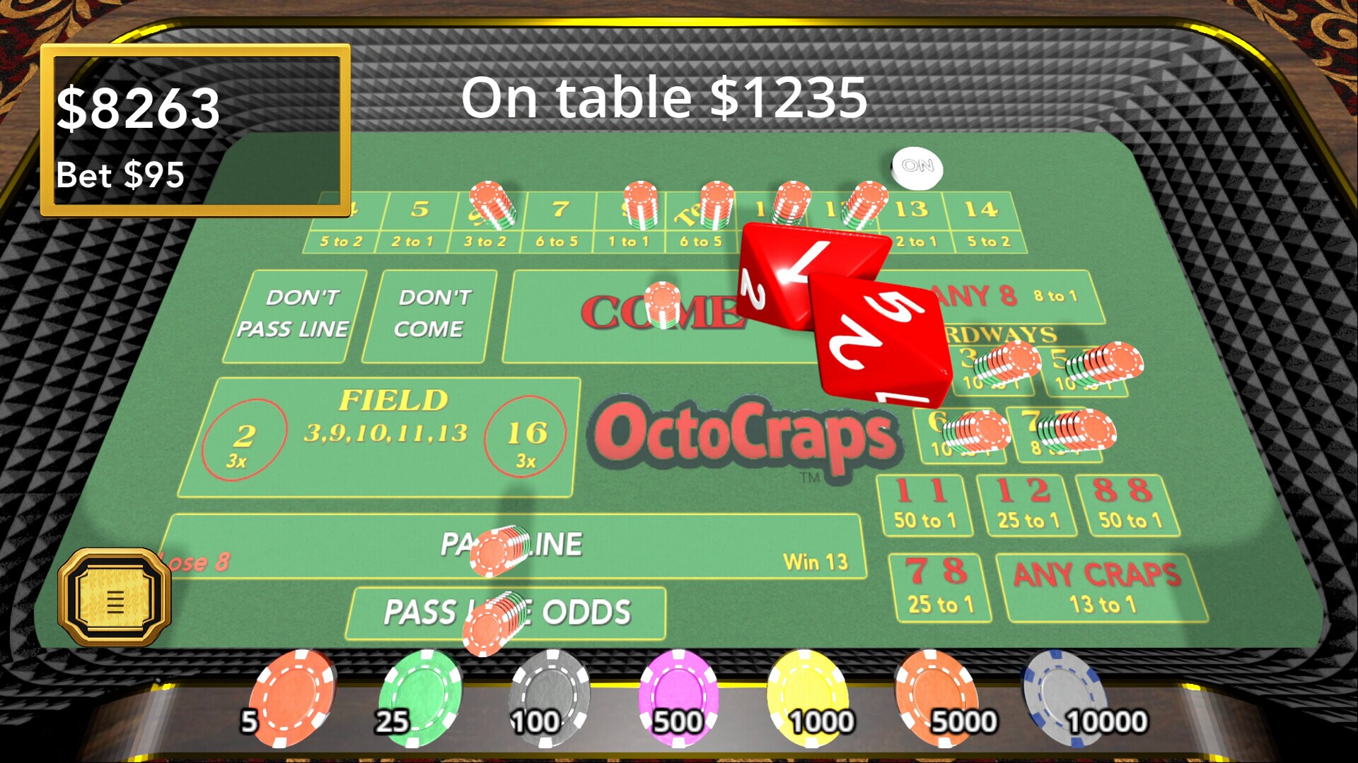 THE GAMEOctoCraps, the craps you never asked for!Roll eight-sided dice, place your bets, and try your luck in this fast, unpredictable twist on a casino classic. The table looks normal enough—until it doesn’t.FEATURESOdds updated for 8-sided diceDice use physics for randomness8 takes the place of 7 from standard craps