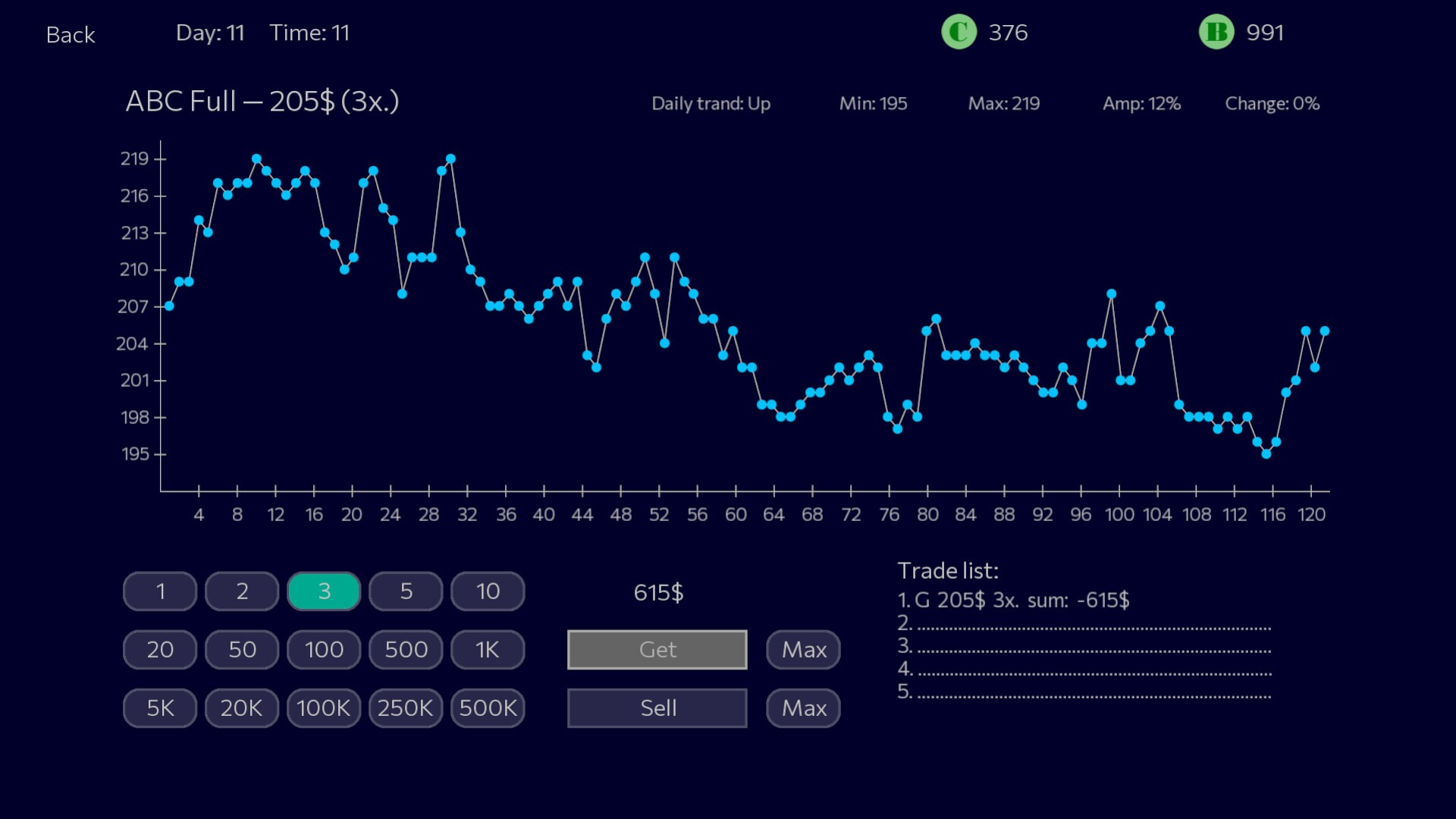 Panic Sell is a free trading simulator where markets are crazy, coins are jumping, and your choice decides the fate of your virtual wallet. Your motto in this game is: buy low and sell high. Try not to lose all your money, but on the contrary, become very successful.In this game, you are waiting for 10 coins that change in value randomly. However, Panic Sell has some secrets that will help you increase your chances of successful transactions. Every 20 price marks there is a line that blocks the price from moving into another range with a probability of 70%. And every 60 marks there is a line that blocks 90% of attempts to cross the line. Use these support and resistance lines to win.You can buy or sell any number of coins if you have enough budget for it. Time is running out and prices are changing every few seconds. Therefore, sometimes it is worth acting quickly, and sometimes it is worth waiting for a more opportune moment. The main objective of the game is to achieve the largest possible total capital.Learn to catch prices near support and resistance lines in time. Be patient. Observe. Act accurately and quickly. Go ahead!
