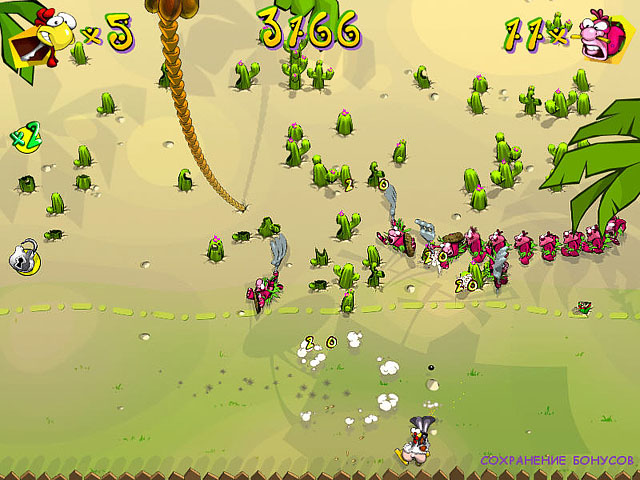 Аркада, где орды голодных папуасов атаковали небольшой тропический остров, чтобы приготовить себе обед из курочки. Теперь курочка вооружилась и готова мстить!