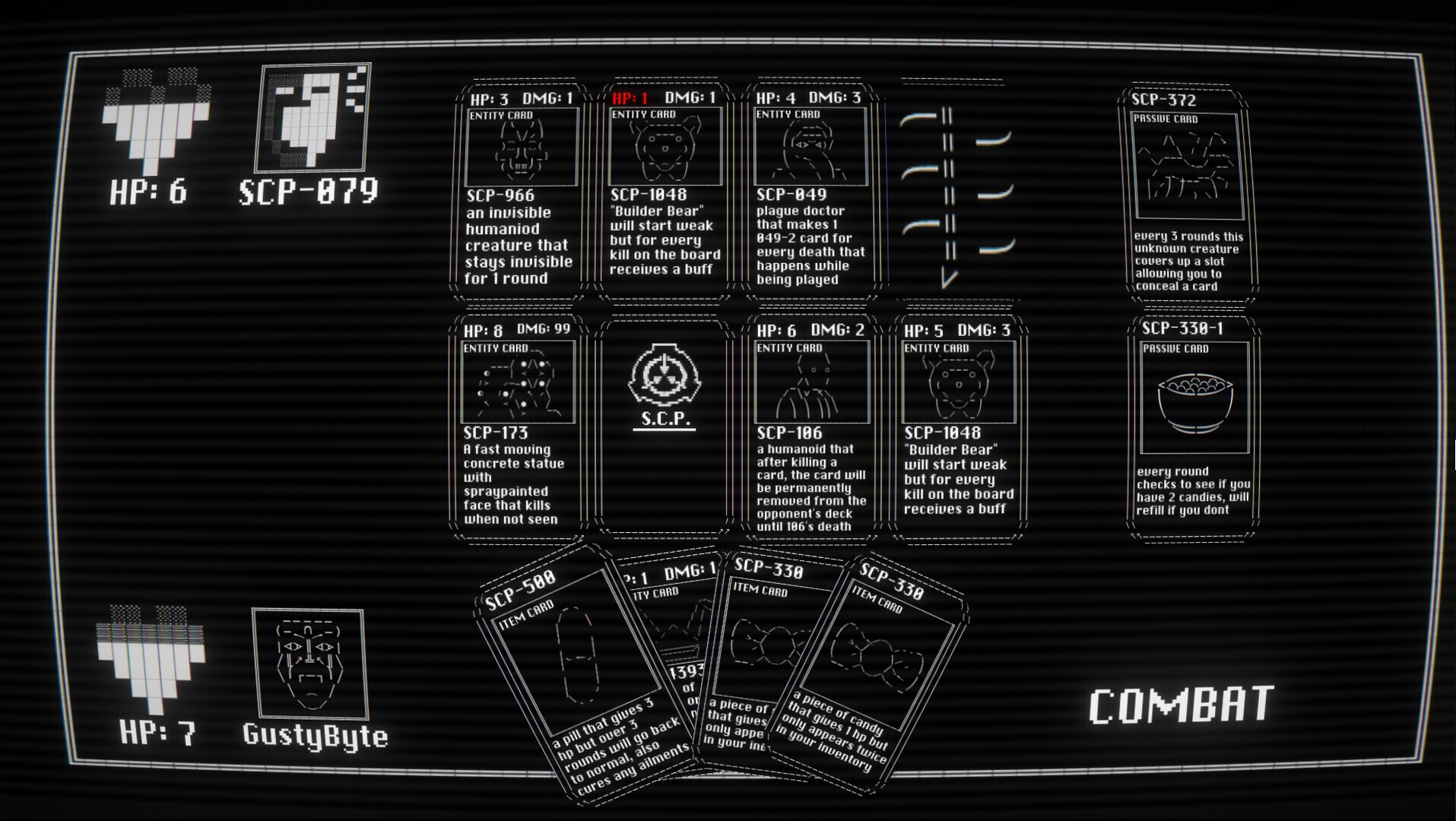 SCP: CARDTAINMENT BREACH is a singleplayer free-to-play strategy deck building game based on the SCP Foundation universe, an open source horror/fantasy writing project starring hundreds of anomalous objects and creatures. THE STORY In this game, you play as a human prisoner designated D-9341 who has found themselves inside of SCP-079s containment chamber due to a containment breach in which dozens of entities have escaped and caused havoc.You then find out that 079 was the one who instigated the breach, and similarly to you, has the same goal as you: freedom.079 is willing to form an uneasy alliance, as you would make its job much easier. However, it does not fully trust in your capabilities, and due to the nature of the facility, cannot trust you unless you are useful to it.079 needs to know if you are capable and intelligent enough to be useful, and luckily has a program built into itself that the foundation used to play with it to test its capabilities.If you fail the game, 079 states it will have to dispose of you through lethal means.This game however, to prevent 079 from learning even more data about the outside world, was based entirely off of the creatures and objects stored in the facility.This allowed 079 to piece together how the creatures worked and how to best exploit their weaknesses and strengths, and was able to formulate a plan for a containment breach. THE GAMEPLAY In this game, you put together a deck of 8 cards, including:5 entity cards (SCPs like 173, 096, 106, 049, etc.)2 item cards (131, 009, 500, etc.)1 passive card (001, 207, 018, etc.)The game has a turn based structure in which both you and 079 will place down one entity card and one item card per turn. Afterwards, the cards enter the "combat" stage, in which every card on the board, from top-left to bottom-right, will use their abilities. Some cards have special abilities, other cards can be stacked to build up their stats, known has horde cards.Certain passive cards have abilities based on the daytime, which is only visible if a daytime based card is on the board. Every 3 days, the day/night cycle will change.You and the opponent both have 10 HP, and to attack your opponent, your entity cards must enter the combat stage without having a card on the opposing side, thus leaving them open.Max HP can be configured before starting the game.Once you've proven yourself to 079, you can attempt again to see if you can beat it with a different or better strategy. This time, 079 does not threaten you with fatal consequences if you lose.You can play as many times as you want, as even if you lose and are "disposed of" you may re-enter the game and try again.