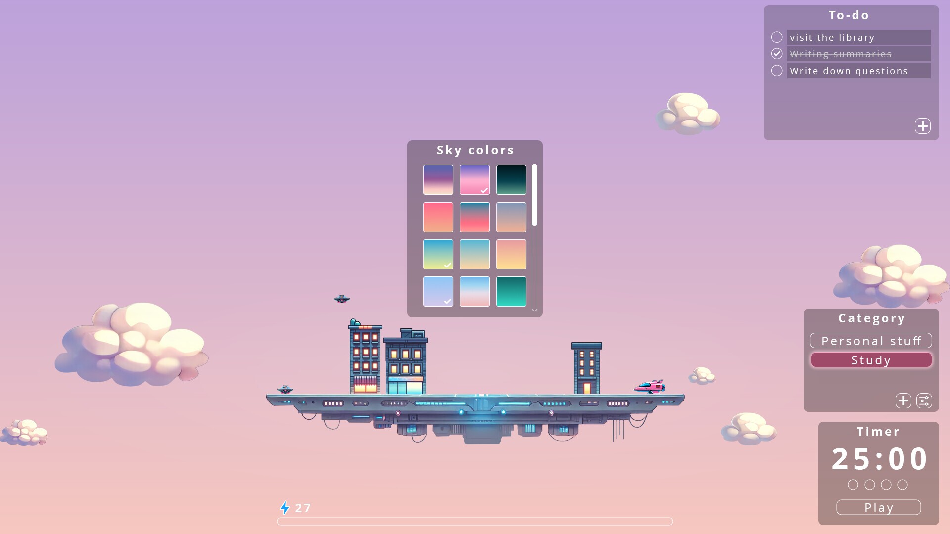 Transform your work time into tangible progress as your futuristic floating cities grow with each focus session. Customize your city’s look and feel to match your personal goals and style.Built-In Pomodoro Timer