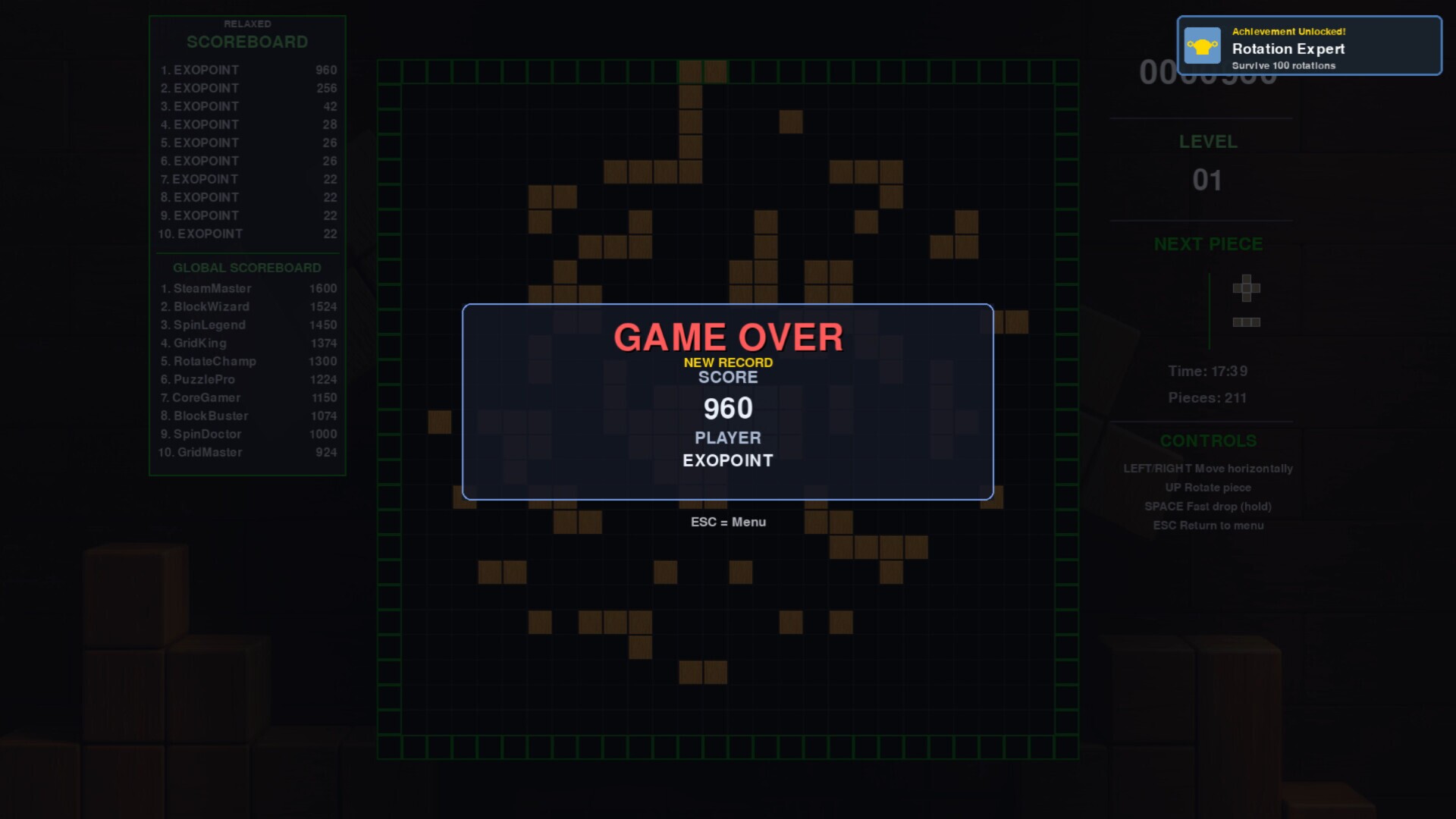 A fresh twist on the classic block puzzle formula.SpinGrid challenges your reflexes and strategy in a rotating arena where the rules are simple but the gameplay is endlessly engaging. Instead of clearing lines, you’ll need to create solid 3x3 block formations — all while the playfield spins and an indestructible core stone sits at the center of every match.Every move counts. Every rotation changes your perspective. Can you adapt and outlast the spin?Key Features🌀 Rotating Arena – After every round, the grid spins, forcing you to think ahead and adapt your strategy on the fly.🪨 Core Stone Mechanic – The unbreakable stone at the center changes how you place your pieces, making every match feel unique.🧩 3x3 Challenge – Forget line clears; the goal is to form 3x3 blocks for points. Simple to learn, tricky to master.Three Game Modes:Relaxed – No pressure, no speed increase. Perfect for practicing or unwinding.Standard – Classic puzzle action with gradually increasing drop speeds.Hardcore – Faster, tougher, with falling stone blocks that can only be destroyed through clever play.🌍 Global Leaderboards – Compete against players worldwide in all three modes and prove your block mastery.Why Play SpinGrid?Whether you’re looking for a relaxing puzzle session, a test of quick thinking, or a competitive score chase, SpinGrid offers something for everyone. With its simple controls, rotating twist on classic block puzzlers, and addictive gameplay loop, it’s a game you’ll keep coming back to.Get ready to spin, place, and outsmart the grid.