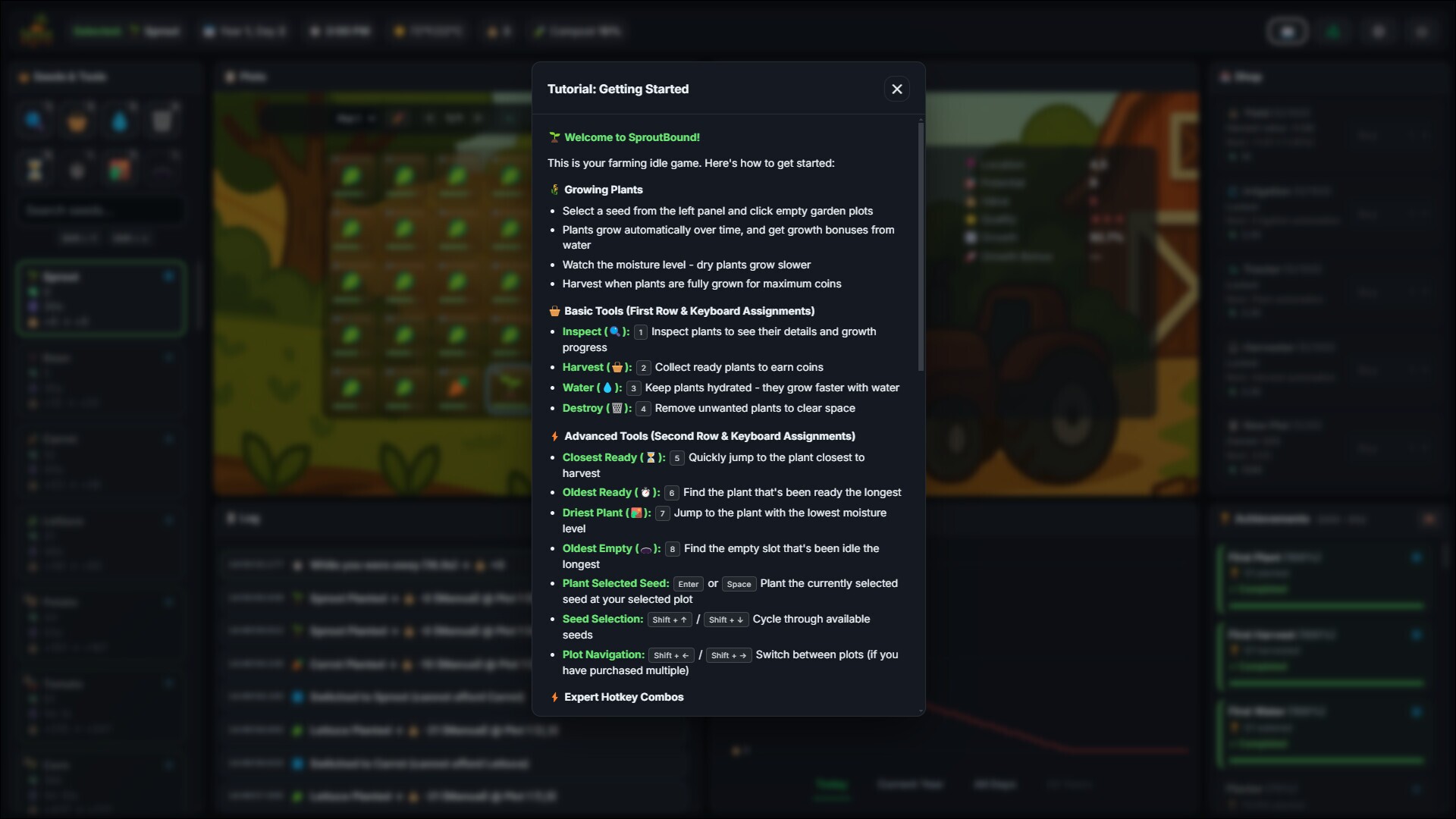 💧 Moisture & quality system: Three-star tiers affect growth speed and crop value📋 Expandable plots: Name each plot, perform bulk actions, and manage layout📈 Upgrades & prestige: Enhance yield, equipment, and gain permanent growth bonuses💤 Offline progress: Your farm runs for up to 8 hours while you’re away, with clear catch-up summaries🔍 Detailed tooltips: Real-time growth data, projected value, and water usage🏆 Achievements: Track upgrades, milestones, and seed diversity⚙️ Low system impact: Runs quietly in the background as you work, play, or relaxDescriptionGrow your garden from the ground up—plant and water crops by hand, keep them watered, and gradually automate each step to keep things running even while you’re away. Every system is designed to be satisfying, flexible, and rewarding, whether you’re actively playing or letting things idle.Start with just a few seeds and simple tools. As you expand, unlock smart automation systems like the Tractor, Harvester, and Irrigation to handle planting, harvesting, and watering in efficient, continuous cycles. Sell your harvest to earn coins to grow your operation, improve yields with upgrades, and reset (prestige) while keeping your unlocked seeds and achievements, along with gaining permanent growth and yield bonuses.Each plant tracks moisture and growth; keeping plots watered boosts quality tiers, speeding up growth and increasing value. Expand into new plots, name and manage them individually, and enjoy offline catch-up summaries that show how your garden thrived while you were gone. A wide set of achievements and detailed stats invite casual collecting or deep optimization—without pressure.Unlike many idle or incremental farming games, SproutBound adds depth with moisture/quality tiers and nameable plots — giving your farm a unique personality while keeping the cozy idle experience intact.Additional NotesNo forced timers, no fail states—just peaceful progression. Perfect for short check-ins or long idle sessions.