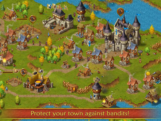 Develop your tiny village to a grand medieval empire with a thriving economy and happy villagers! Find spots for mining ore, harvest the crops of your farms and collect coins as taxes from your folk. Build jousting fields, taverns, marketplaces and beautify your city with impressive statues, magnificent monuments and lush gardens. But there are also dangers lurking close by. Bandits are in the area, looking to plunder and pillage your peaceful town. Build barracks, guard towers and recruit brave soldiers to protect your citizens from harm. You rule the whole empire from your castle and make sure your inhabitants have fun and stay happy!
