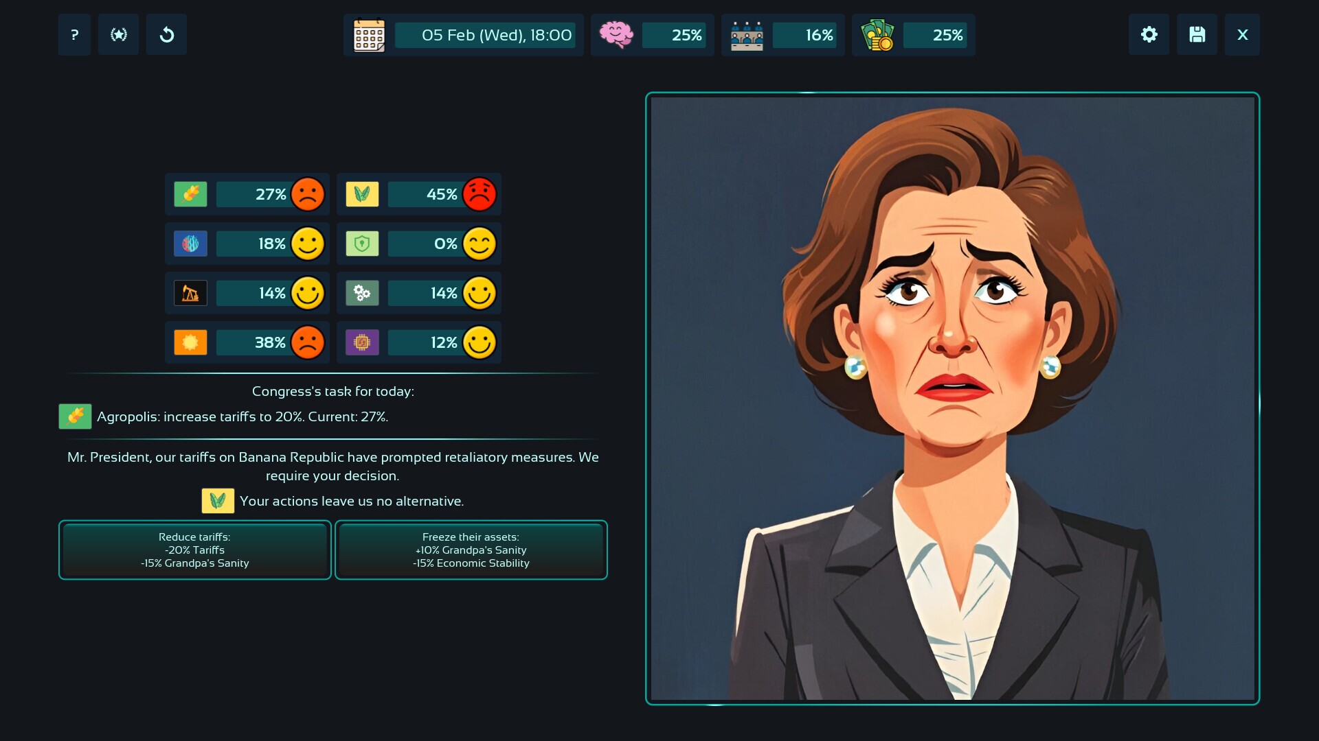 You are the greatest president, but your sanity hangs by a thread. Only imposing tariffs brings you joy and clarity of thought. Each new tariff is like a breath of fresh air for your mind. But be careful: your aggressive actions could trigger a wave of consequences that won't be easy to deal with. Can you find a balance between your inner peace and the stability of your power?You are in for a classic match-3 game. Match lines and combos of country flags to impose ever harsher tariffs on them. The bigger the combo — the stronger your impact!Your goal is to maintain a fragile balance between your sanity, the support of Congress, and economic stability. Review incoming bills to gain the approval of politicians. Avoid targeted strikes on the same countries — their retaliatory sanctions could crash your economy. Remember: every action has consequences!If Congressional support drops to zero, you will face impeachment and a shameful resignation. If the economy collapses, the country will plunge into chaos and your reign will end in ruin. Every decision you make carries weight. Will you be able to hold on to power and avoid disaster?This game is a light-hearted satire on the absurdity of world politics. Anything goes here. Relax and enjoy the craziest power simulator!