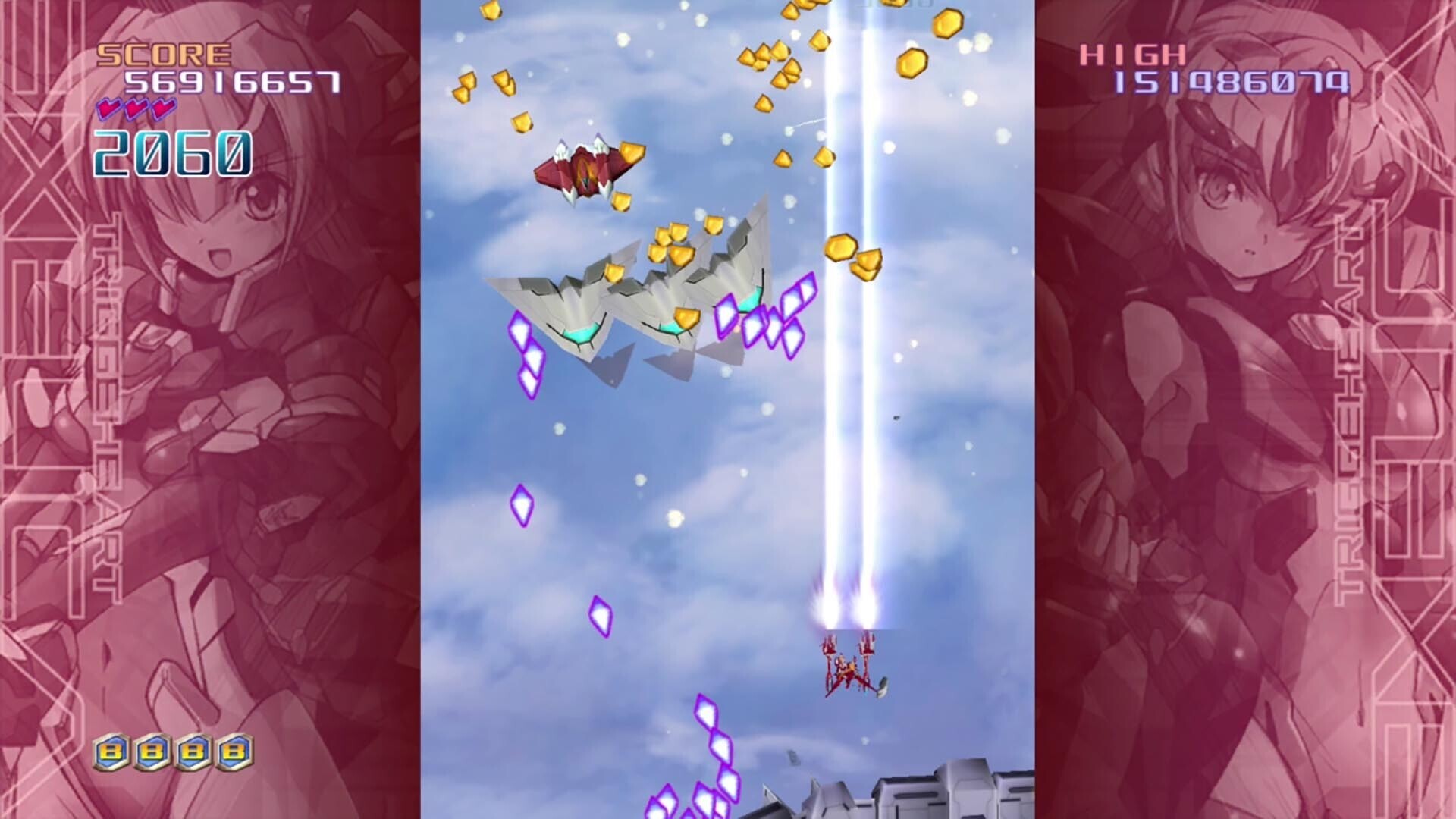 New game experienceOperation▼Screen Description1. Score Points scored during this game.2. High Score Your all-time best score.3. Life You lose one life each time you get hit by a bullet. Get hit when you have 0 lives and it's game over.4. Total Points The total number of points you gained in the level from collecting items. This will affect your score after completing the level, as well as affecting the difficulty of the boss fight.5. Bombs The number of remaining bombs. It is recovered by acquiring bomb items.6. Character This is the character you control.▼Screen icon explanationPower-up: Increases fire power by 1. Bomb: Increases the number of bombs by 1. You can have up to 6 bombs. Score Item: Increases player score.*Playable character "Faintia"Trigger Heart Faintia appears as a playable character.Faintia has been redesigned for this game and is equipped with a special laser that allows for sustained attacks.Enjoy Enhanced with a slightly different attack style from Exelica and Cruelica.*Playable modes・Arcade modeIn addition to Exelica and Cruelica, Faintia's short story and ending will be added.The score calculation method has been changed from the arcade mode of the previous game, Trigger Heart Exelica.▼Score calculation methodOne difference between "Trigger Heart Exelica" and "Trigger Heart Exelica Enhanced" is the way the score is calculated.In Trigger Heart Exelica, the score multiplier changed when you destroyed an enemy with an Anchor Shoot, but in Enhanced, the score multiplier does not change even if you use an Anchor Shoot.・Enhanced story modeA mode in which a story using approximately 70 still illustrations unfolds with full voice.The illustrations have been made high-resolution, allowing you to experience the world of Enhanced, which has become even more beautiful.・Opening movie includedA fully animated opening movie produced by P.A.WORKS has been added, and the theme song is "GRAVITY ERROR" (sung by Ayane)※Other features・Steam RankingsSupports Steam-specific internet rankings.Faintia rankings have been implemented.Aim to become the best Faintia user in the world!・Training mode・Vertical screen support (arcade mode only)