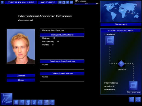 You use the money you earn to upgrade your computer systems, and to buy new software and tools. As your experience level increases you find more dangerous and profitable missions become available. You can speculate on a fully working stock market (and even influence its outcome). You can modify peoples academic or criminal records. You can divert money from bank transfers into your own accounts. You can even take part in the construction of the most deadly computer virus ever designed.