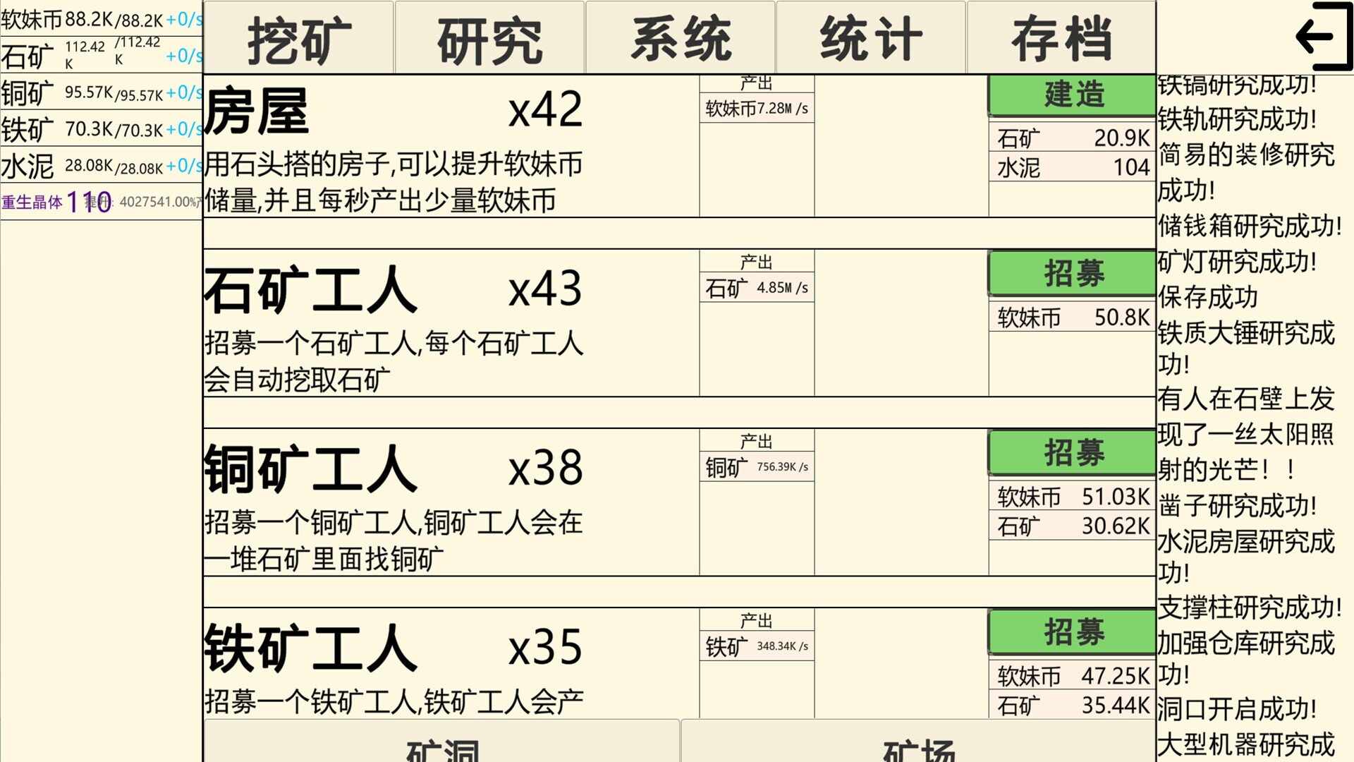 Click the mining button to start your resource collection journey. Every click will yield precious mineral resources, which are the foundation for your growth and development in the game world. Use the collected minerals to engage in technological research and unlock one powerful technology after another, from basic tools to complex automation technologies. The power of technology will safeguard your adventure.