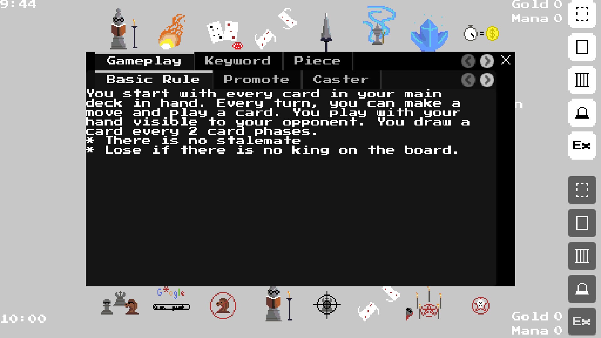 Chards is a strategic card game that you play chess with cards. Although this is a card game, this game has basically 0 RNG mechanic. This game emphasizes strategic thinking and planing. Some new pieces are added to the game. You can get them by using card effect or promoting. Use these cards and pieces to craft your own strategy and defeat your opponent.Basic RuleYou start with every card in your main deck already in hand. Every turn, you can make a move and play a card. You play with your hand visible to your opponent.You draw every 2 draw phases. Whenever you draw a card, you draw card from your discard pile.You can have up to 8 cards in your main deck, up to 5 pieces in your extra deck. FeaturesUnlimited number of decksNo restrictions on deck buildingOnline PvPLocal Play (requires running 2 instances of the game)