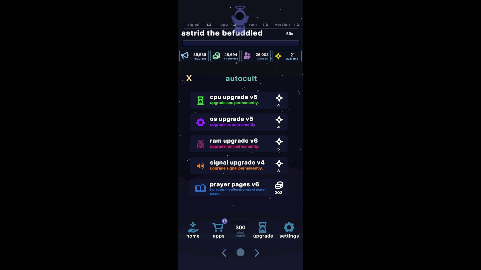 hey. want to start a cult? slides you this old, kinda glowing phone this phone? it's your new bff (if cult leader is your dream job). it's a cozy incremental game. you tap, numbers go up, and you build a surprisingly deep cult-y media empire.the phone's the key. it gets passed down, leader to leader. now it's your turn. grab apps like faithbook, instagrim, & hypnoscroll. you'll be optimizing faithbait titles, analyzing cult trends, responding to followers and, y'know, normal cult stuff.gather your flock: collect faith, cash, and followers. leader stats grow (mostly) with age and really help out. but they get kinda tired. and old.new beginnings: leaders eventually ascend. they leave behind 'devotion dust' (currency) for new apps and sweet permanent upgrades. then, the phone finds a new leader.let it flow: you'll tap a bit at first. later? automate resource gathering, even influencer minigames. just chill and watch your cozy cult expand.new cult, who dis?: who even gave you this phone? might be fun to find out.so yeah. download apps. play quirky influencer minigames. automate all the things. ascend for power. unravel a weird mystery. all from this one special phone.it's pretty chill.(until it isn't. jk. probably.)