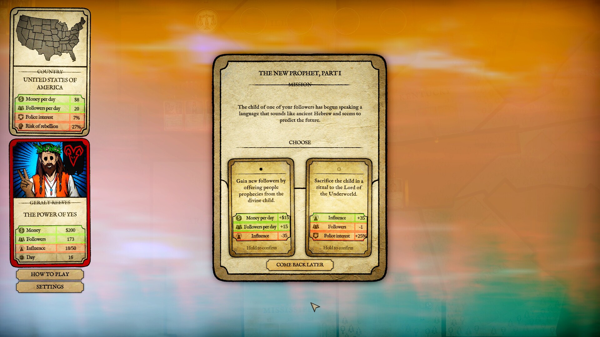 Execute Your StrategiesPlay strategy cards to expand your cult and turn it into a powerful organization. Every choice matters! Some moves will bring in new followers, while others might attract unwanted attention from the authorities. Unlock New CardsGrow your deck by acquiring more powerful strategies. From subtle manipulation to outright madness, each new card unlocks fresh opportunities to reshape your cult's destiny.