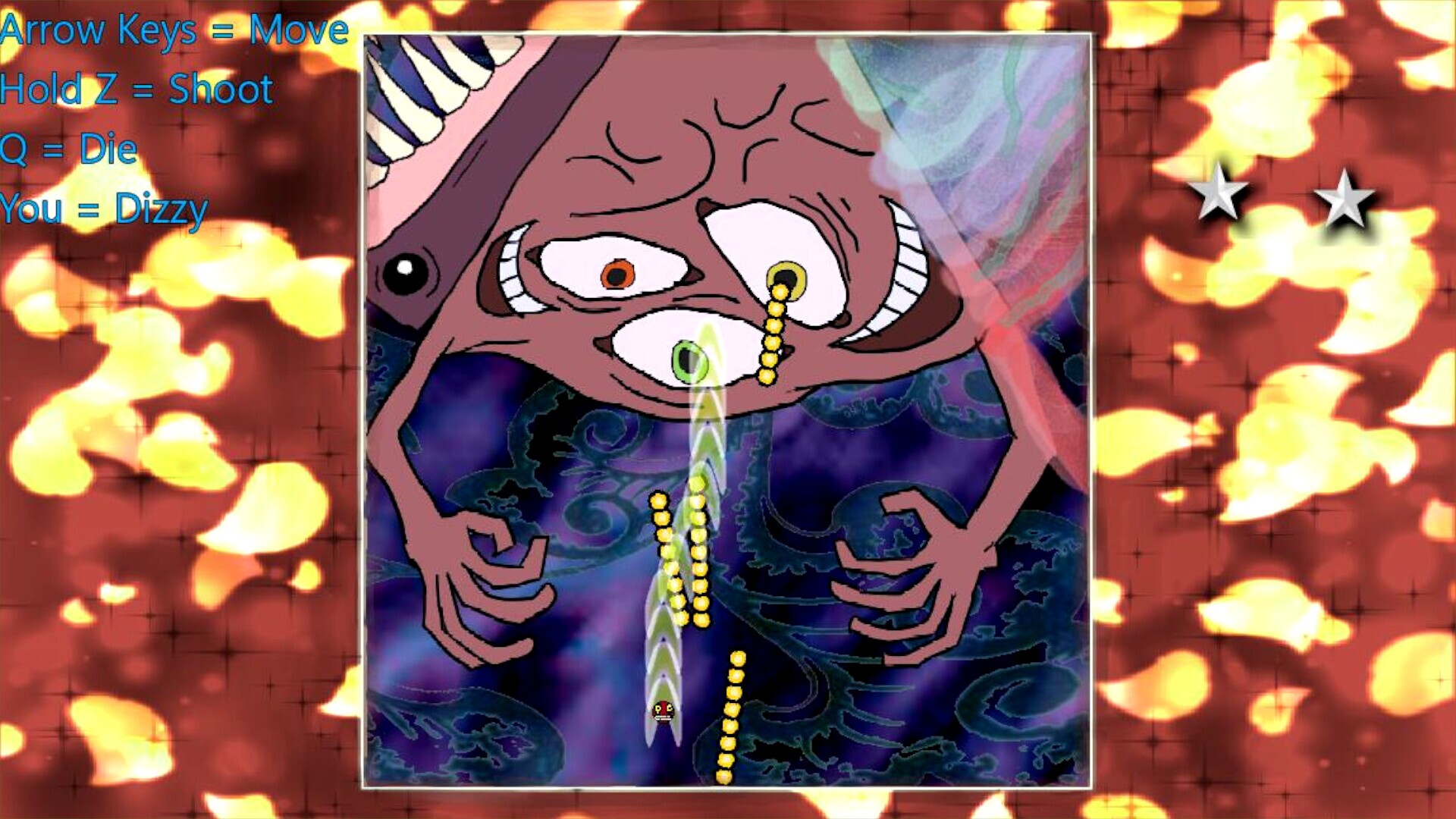 IntroThis is a short game about a little face who's tired of being so dizzy all the time! Luckily, they find the source of this dizzyness and get to work destroying it from the inner sanctions of their mind. You play as this face, dodge bullets and kill a giant wheel! Its weird and wacky, so if you like that type of thing, totally pick it up!!!GameplayThe game itself is as simple as can be: when you start the game and get through the monologue at the beginning, you are presented with a player character that you move around with the arrow keys inside of an area defined by a border, and a giant wheel at the top. this wheel has wedges that each act as their own multi-phase boss. each phase activates bullets spawners, which volley bullets across the screen for you to dodge, and you progress though the game by holding the shoot button [Z] to fire your own bullets at the wedge. if your lives represented by the stars in the top right deplete, its game over. but don't worry! every time you defeat a wedge, you gain a life! The game has some sharp difficulty spikes throughout, you move pretty fast, and there are some surprises all throughout, making for an all-around hectic experience that will leave you pining for the win! you also get a reward if you win, based on your performance. They're nothing special, but make sure to screenshot your reward if you got a good one, because the game doesn't save data across playthroughs.Making ofThis game is a bullet hell inspired by the likes of touhou, and originally meant for the 2025 Boss Rush Game Jam on itch.io! I designed it on the side while working on another submission with a team, and i liked my idea so much i ran with it! I couldnt get it submitted to the jam in time, but 8 months later i finally finished it! This game was almost entirely developed by myself, with some assets being royalty-free like fonts.I also plan to use some of the stuff i made for this to make a bullet hell maker, so look forward to that!