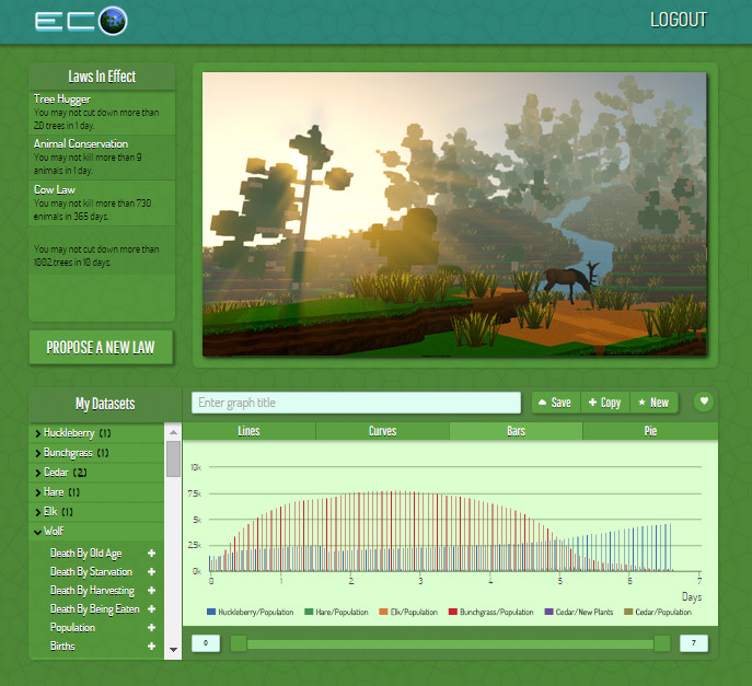 Enter the world of Eco, where you must team-up to build civilization and prevent a disaster, using resources from a fully simulated ecosystem, where your every action affects the lives of countless species.