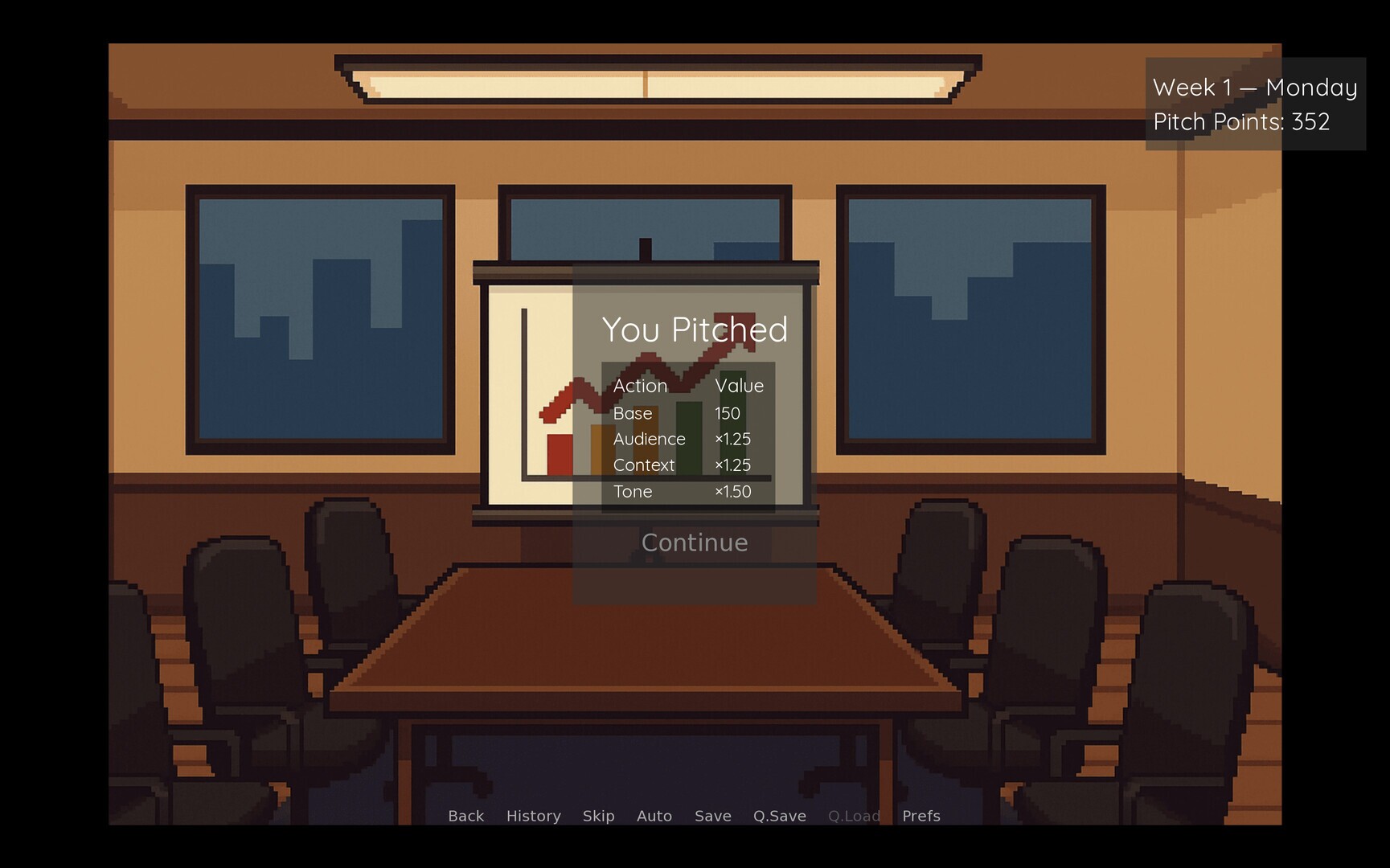 Elevator Pitch is a satirical narrative game set in the cold, fluorescent-lit world of corporate absurdity. You play as an eager employee with one mission: deliver your pitch to the boss during a short elevator ride—and survive the encounter.As you rise through the building, you'll face increasingly intense (and unreasonably muscular) executives, rival coworkers, and strange office politics. Navigate branching dialogue, make choices that shape your fate, and develop your character’s professional edge with each pitch. The loop is simple: ride, pitch, adapt—but every floor introduces new surprises.
