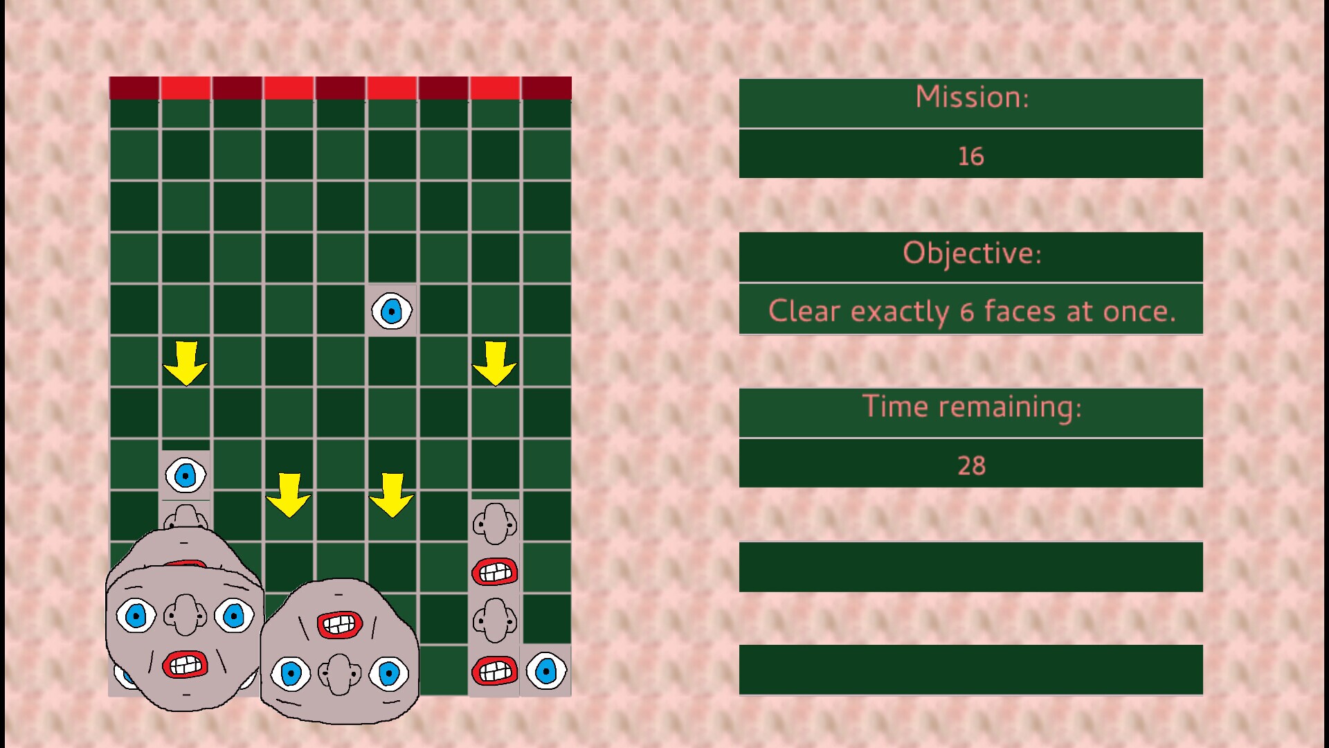 Falling Face Fragments is a falling block puzzle game. As eyes, noses, and mouths fall from the sky, you must carefully choose where they land in order to assemble faces correctly and clear them. There are three modes of play included:1. Arcade mode: Score points by clearing faces. Completed faces are cleared on a button press, and the more faces you clear at once, the more points you'll receive. As time passes, the falling speed of the face fragments increases and force-drop arrows appear more and more frequently, clearing faces will reduce the difficulty based on the amount of faces cleared at once. Keep playing until a piece of face lands in the top row of the game board, try to beat your own high score!2. Multiplayer: Local head to head. Clear faces to send force-drop arrows to your opponent, the more faces you clear at once, the more force-drop arrows are sent to the other player. Whoever has a face piece land in the top row first loses.3. Mission mode: Play through a series of levels with different puzzling objectives. Many of these levels have some face fragments pre-placed, and you will have either a set amount pre-determined falling face fragments or a limited amount of time to complete the tasks. Mission examples include emptying the entire screen of face fragments, clearing a specific number of faces at once, killing the caterpillar, and more!Each completed and cleared face will thank you with an "uh!"