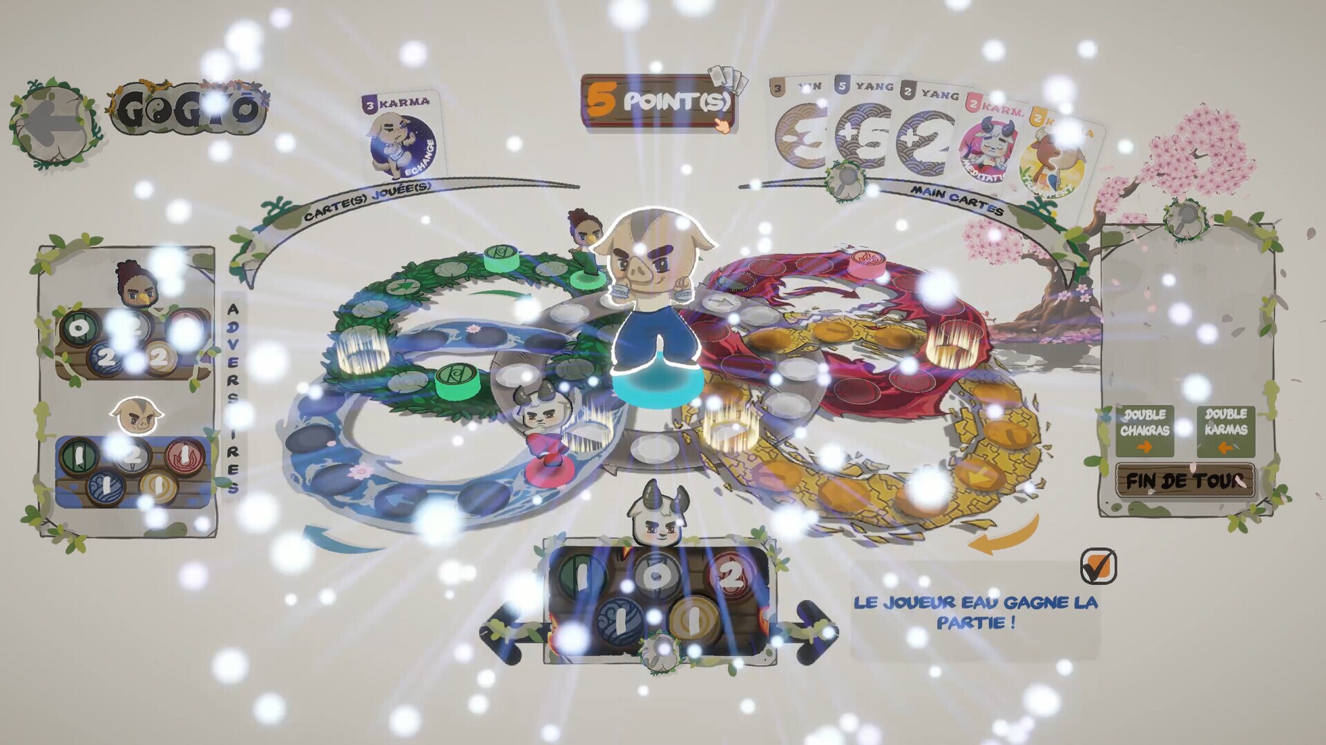 To move, 3 types of cards are available:- "Yin" to move backwards.- "Yang" to move forward.- "Karma" to interact with your opponents.Each chakra collected on the element circles (Wood, Fire, Earth, Metal, Water) makes you a Master of that element.The first Master of 5 elements wins the game.
