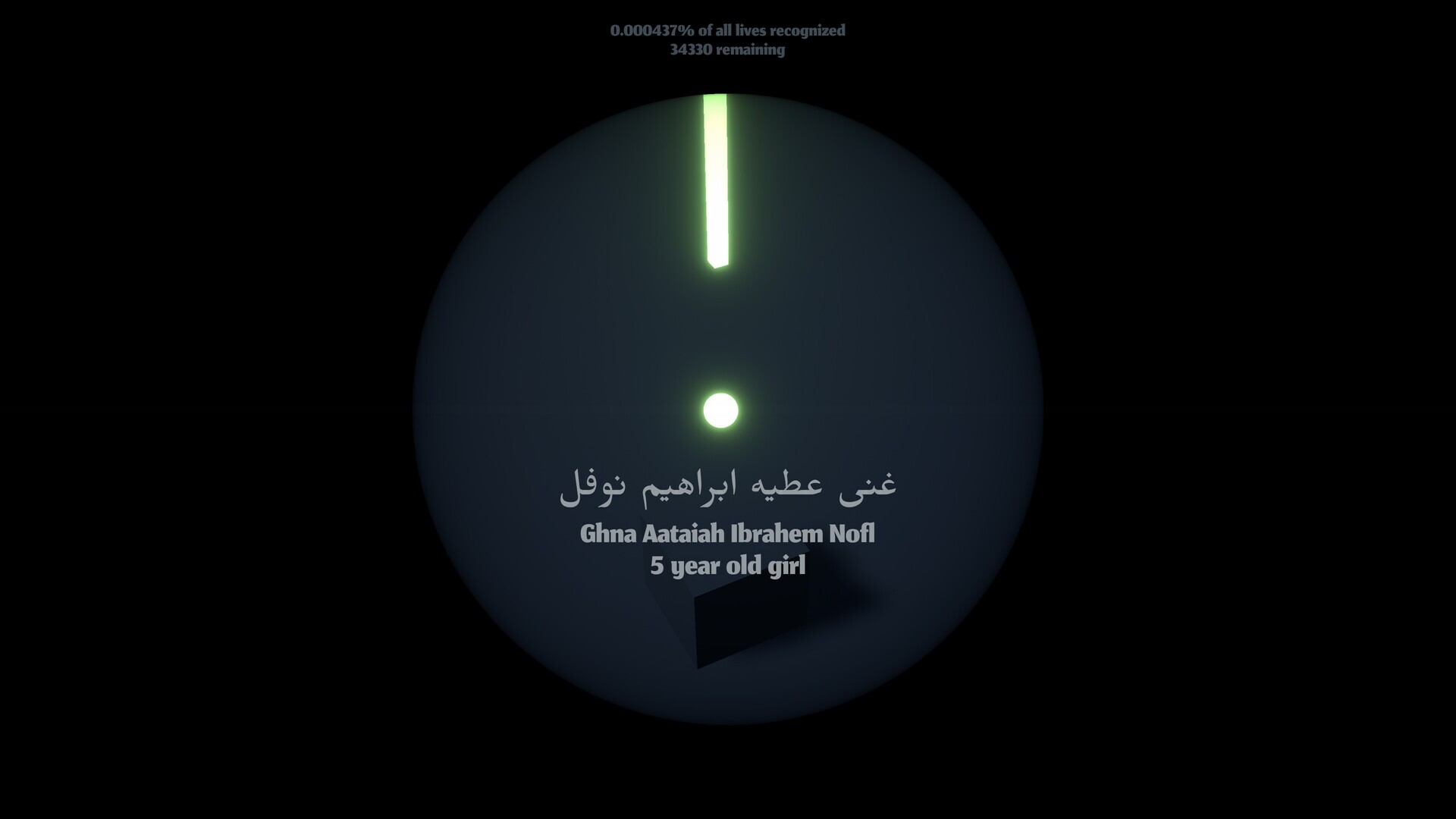 It is presented here as an offline experience for greater accessibility and fidelity.No such physical memorial recognizing each individual exists as of yet. Pay respects to each of the over 60,000 departed in a peaceful refuge for their memory. Come back at any point to pick up where you left off - every session in the grove begins at a new location. The grove includes a single memorial for the countless lives that remain unaccounted for. I made this memorial to humanize the statistics and provide an accessible experience for people across the world to honor those lost. I hope this can be a respectful place for loved ones and strangers alike to reflect on our shared humanity. May we learn one day to be better.-Nick Oueijan