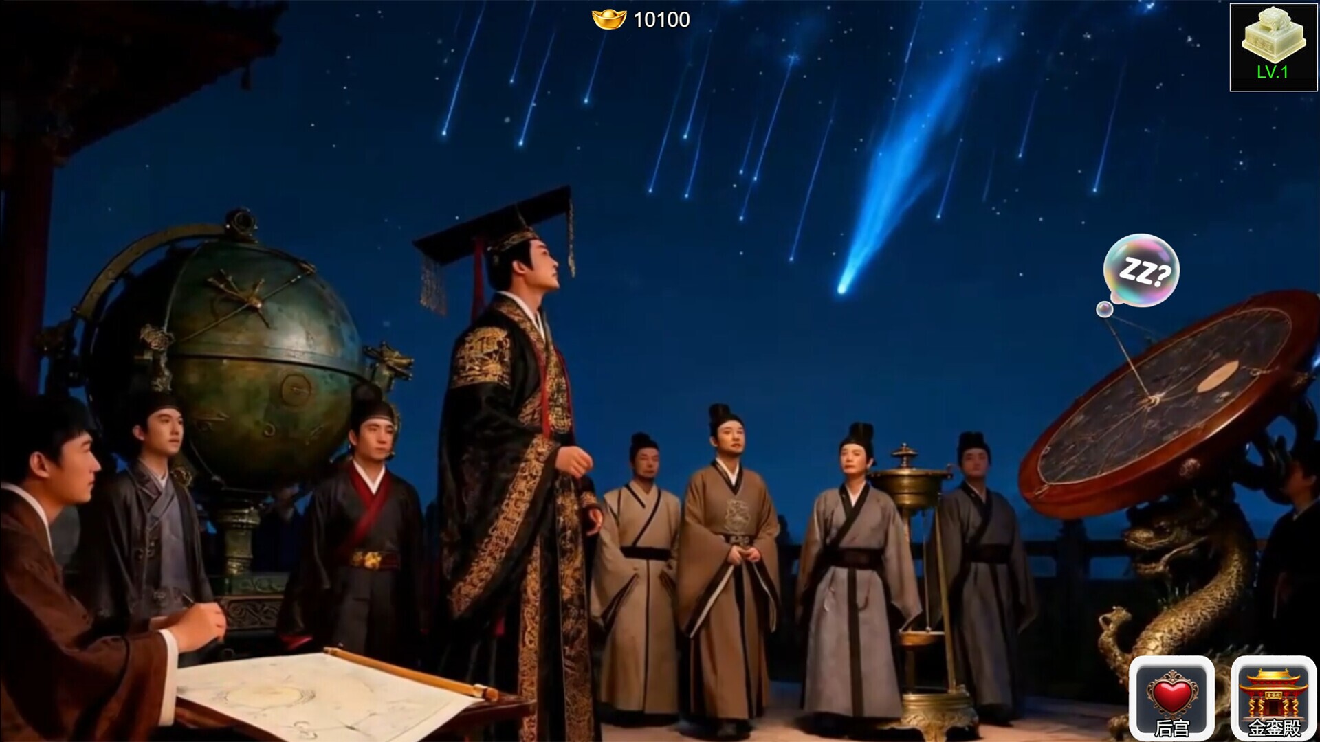 Players take on the role of an ancient emperor, traveling back and forth between the Golden Luang Hall, Zhonghe Hall, Imperial Garden, Qintian Temple, and the imperial harem.1. Golden Luang Hall: Every once in a while, the ministers of the Golden Luang Hall will randomly generate government bubbles. Players can click on the bubbles to choose to handle government affairs. Each government affairs has two different choices, obtaining national luck value or monetary amount. The level determines the number of rewards.2. Zhonghe Hall: Go to Zhonghe Hall and interact with NPC Grand Academician. There are four interactive options, namely: conversation, gift giving, challenge, and plot.*Conversation: Minor increase in loyalty, no consumption*Gift giving: significantly increases loyalty and consumes money.*Challenge: Trigger NPC battles, winning can earn national luck points and money, and increase NPC level. Failure remains unchanged.*Plot: Trigger the exclusive storyline for the Grand Master.3. NPC battles: The NPC level determines the combat attributes, which include "attack, defense, life, critical strike, and speed". Battle losses are calculated in seconds based on the speed of both the enemy and us, with an initial settlement of every 5 seconds. During the battle, bubbles will be randomly generated, and clicking on them can change the situation of the battle. For example, clicking on a bomb bubble can reduce the lives of both the enemy and us.4. Royal Garden: Go to the Royal Garden and interact with the NPC Queen. The gameplay is similar to that of the NPC Grand Secretary in the Zhonghe Palace, with four interactive options: conversation, gift giving, challenge, and plot.5. Qintianjian: Go to Qintianjian and trigger meteor shower recruitment gameplay. Each recruitment consumes a certain amount of money to obtain 10 treasures, which can cultivate concubines in the harem.6. Harem: Go to the harem, cultivate the beautiful Yang Guifei, give Yang Guifei the treasures she needs, and Yang Guifei will offer you a dance. Different treasures correspond to different dance moves. Yang Guifei's upgrade can increase her internal assistance value, which can add a percentage of national luck and monetary benefits.