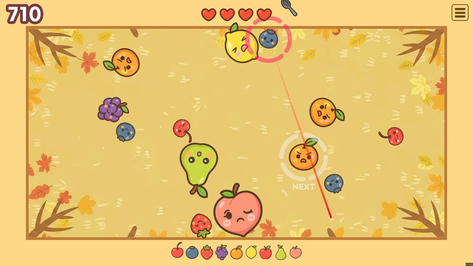 Watch as matching fruits collide, bounce, and transform into larger varieties. Each step forward is satisfying and keeps you coming back.😆 Lively fruit characters