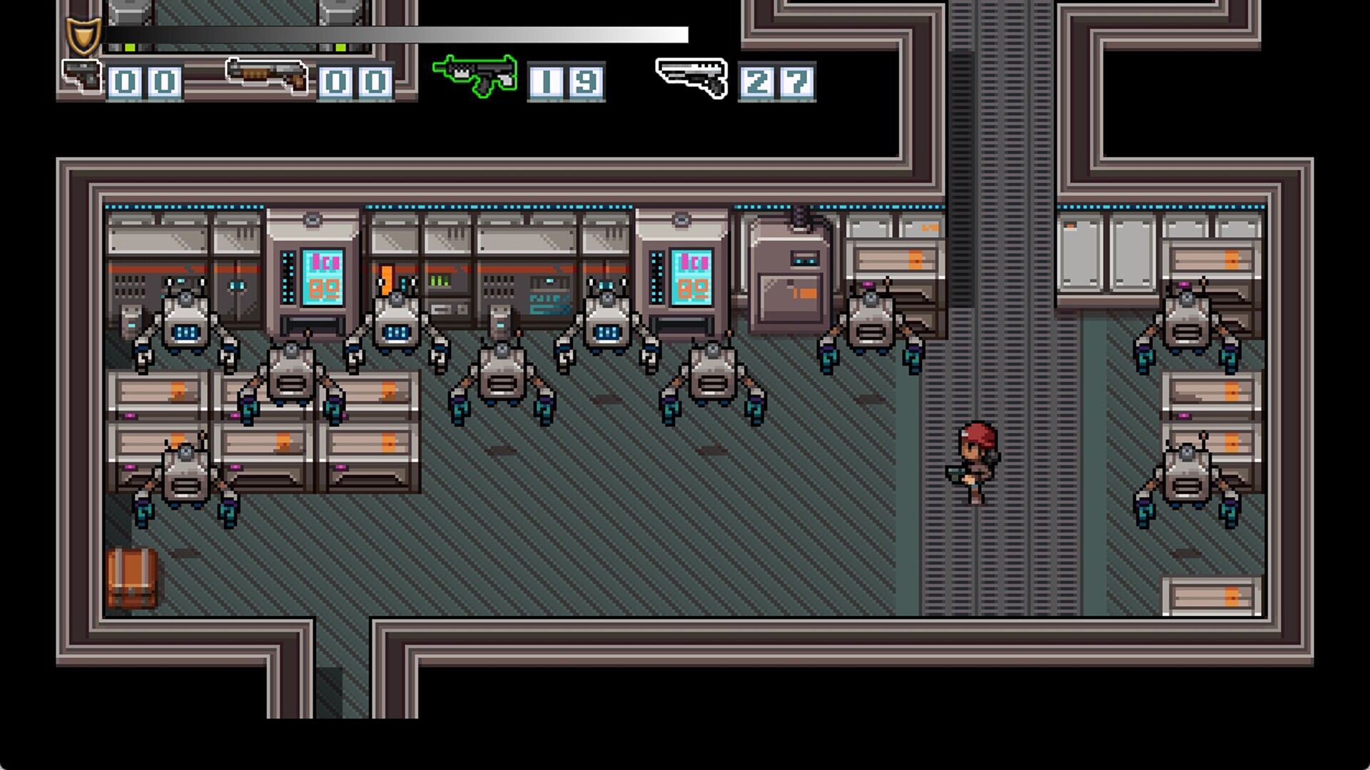 Nadia's Revenge is a top-down 2D pixel-based game where players fight enemies with firearms and solve puzzles to progress through the story, while making choices at branch points that lead to two different endings.Nadia, originally an Elite Agent working for Eternal Life, a giant corporation that has created an entire virtual world within a simulation, discovers she has been betrayed by the company.She becomes the leader of the Rebel Faction and hides within the world of the simulation to seek her revenge.However, she is betrayed by her subordinate, Philip, causing the Rebel Faction to collapse and throwing her into great danger.Fortunately, in a dramatic turn of events, Nadia is revived with the help of Olivia, the most powerful entity in the simulation and the enemy of Eternal Life.Nadia sets out to reform the Rebel Faction and vows to take revenge on both the traitorous Philip and Eternal Life.As the story progresses, Nadia acquires a variety of weapons that she uses to defeat enemies, and solves puzzles to continue her journey.She can also send her newly recruited Rebel Agents on missions, earning SP points and gold that can be used to increase her stats and upgrade her weapons.Ultimately, depending on her choices, she can select one of two possible endings.