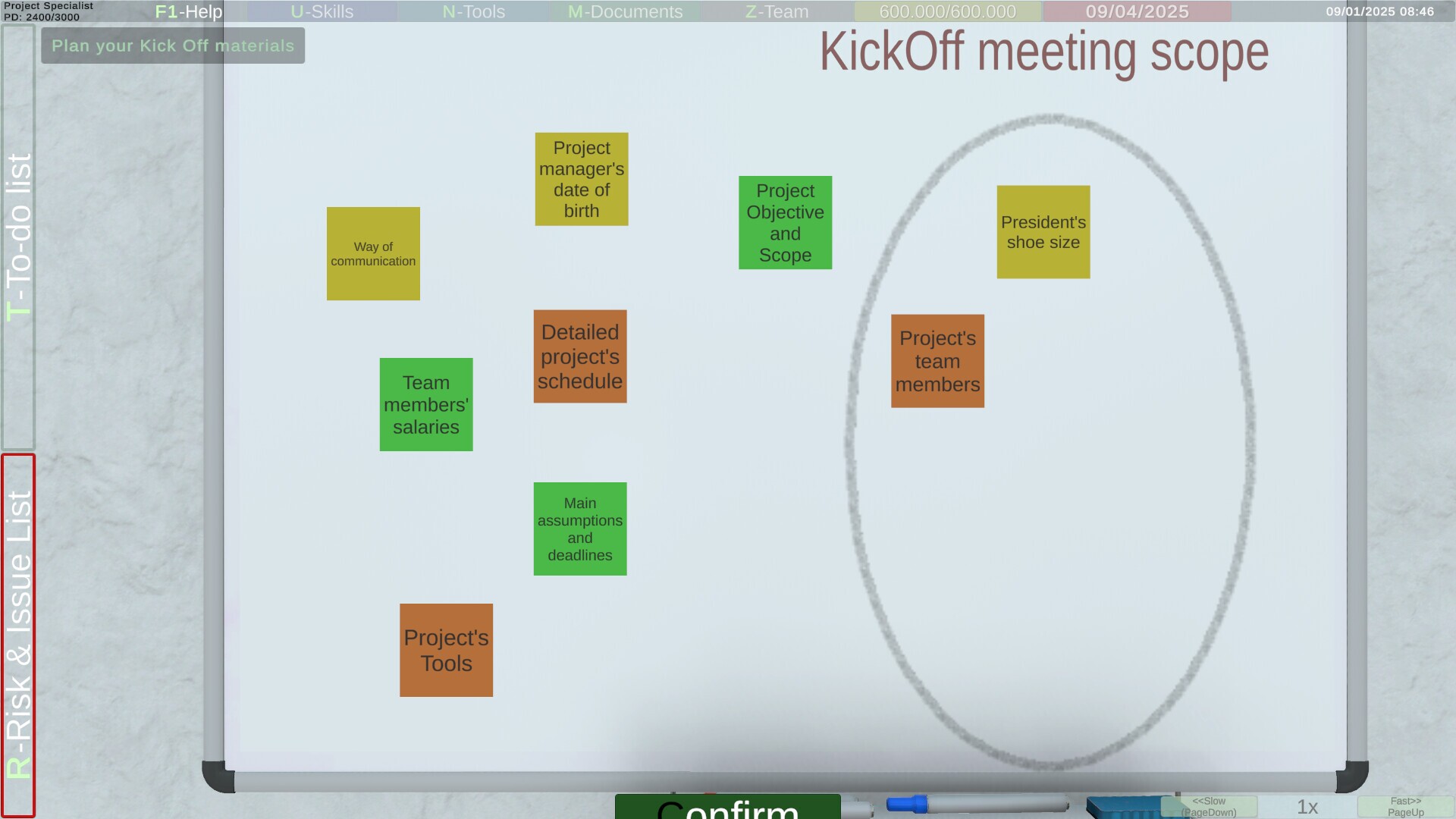 If you want to experience what it's like to be a Project Manager, or test your skills as one, this game is for you. Set in a large corporation, you're given the opportunity to lead your first project.Project Manager (Initiation) begins by selecting a character from among predefined Project Managers with varying levels of experience (which also indicates the game's difficulty level). As a newcomer to the company, you'll first need to familiarize yourself with the layout of the rooms and locate key people in the office building with whom you'll collaborate. Your ability to navigate the company will largely determine the success of your time-based tasks.Next, you'll be tasked with collecting key data necessary to create the first project document, the Project Charter. This task is time-limited, depending on the difficulty level of your chosen character. If your chosen character has limited experience (Easy), you don't have to worry about time, but on Hard, there's no time for bad decisions. Completing this series of tasks will also grant you your first promotion on the PM career path.After confirming the project launch with your supervisor, you have a moment to select KickOff materials (you must select the correct set of tasks with a limited number of attempts) and complete training sessions. One training session is mandatory, but completing more will earn you additional experience points and knowledge of new tools.During the game, you have the opportunity to increase your experience, acquire new skills and tools, but you can only win by achieving the final goal: conducting the KickOff meeting.You must carefully select the participants for this KickOff meeting to ensure that no one is missing the necessary participants, while also omitting any undesirable ones from the invitation.