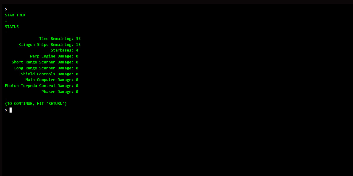 Star Trek is a text-based strategy video game based on the Star Trek television series and originally developed by Mike Mayfield in 1971. In the game, the player commands the USS Enterprise on a mission to hunt down and destroy an invading fleet of Klingon warships. The player travels through the 64 quadrants of the galaxy to attack enemy ships with phasers and photon torpedoes in turn-based battles and refuel at starbases in order to eliminate all enemies before running out of time.