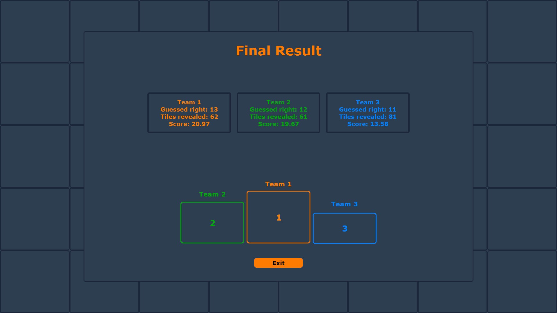 In this entertaining party game, players try to guess images – however, the images are not included directly in the game. Instead, each player or group creates their own folders with images beforehand, and the contents of these images must be guessed. The filenames of the images serve as the correct answers.The goal is to guess the images with as few tiles revealed as possible. The tiles are controlled by the game master: they can be revealed on request by pressing the spacebar or automatically released by a timer.When a player is confident, they announce their guess. The game master then reveals all remaining tiles and records whether the answer was correct or not.During the game, randomly hidden status effects can be collected, which influence the gameplay and add surprises. For example, the "God’s Finger" effect allows the player to choose which tiles to open.In the end, the player who guesses the most images correctly while revealing the fewest tiles wins.Have fun guessing and strategizing together!