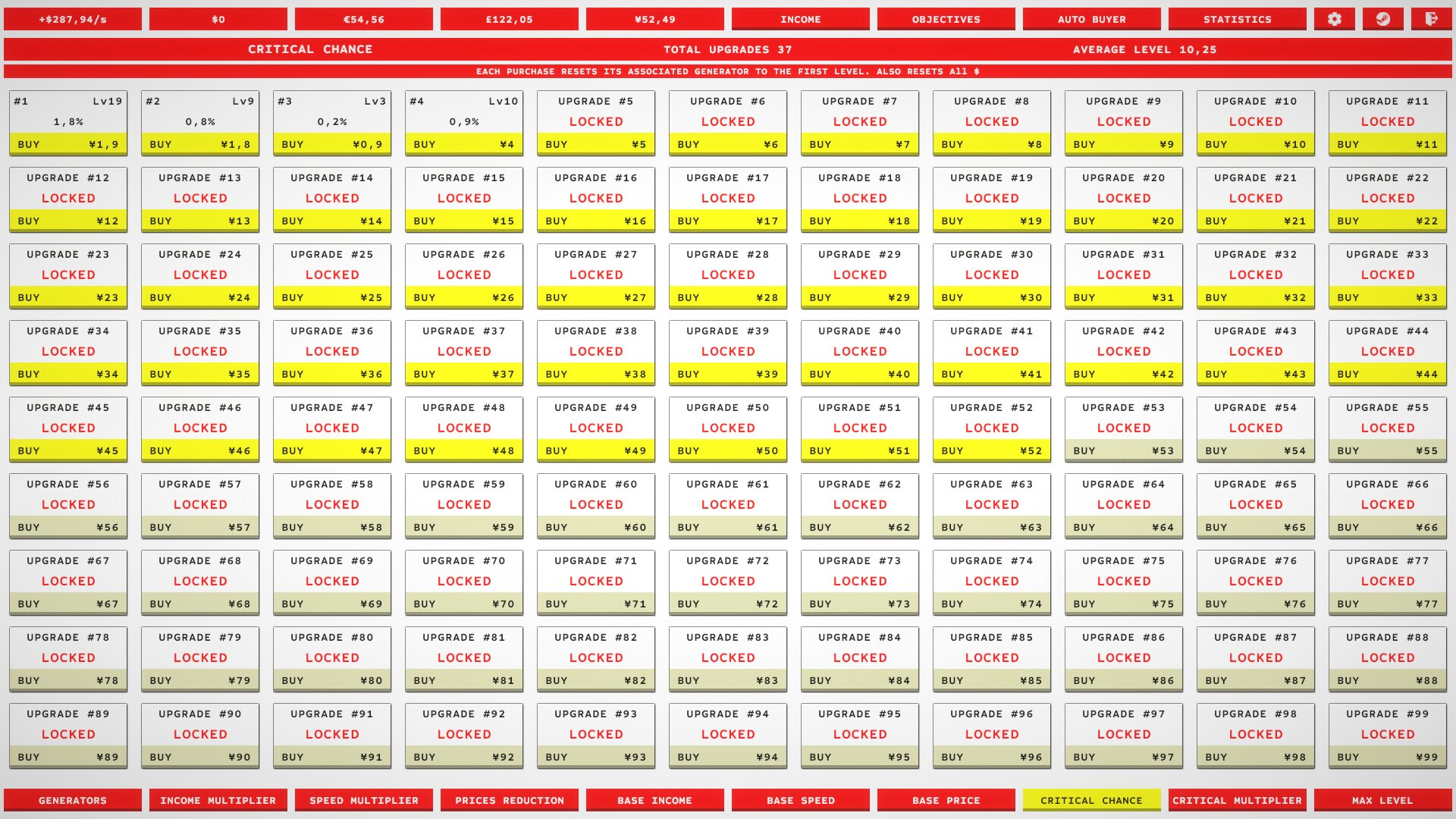 Upgrade It is a unique idle game with near-endless possibilities. Maximize your income by upgrading generators, purchasing powerful boosts, and unlocking new gameplay features. Leverage a unique prestige system to permanently empower your generators after a local progress reset. Collect achievements and complete all in-game goals to claim victory!You start with 99 income generators. Optimize your profits by upgrading each one individually. Use up to 10 special prestige upgrades per generator by performing a localized reset. Invest in special currency generators and find the optimal strategy to complete every goal and challenge!Features:Addictive Idle Gameplay: Easy to start, hard to put down.Deep Prestige System: A complex and rewarding loop of progression and reset.1,000+ Unique Upgrades: A vast array of power-ups to discover and purchase.Full Automation: Auto-buyers and extra currencies passive generators streamline your progress.In-Game Challenges: Optional objectives for added motivation and replayability.Steam Achievements: Prove your mastery and dedication.Polished Presentation: A clean user interface with customizable graphics and satisfying sound effects.Complete Experience: This is a full release, not an Early Access game - dive into a polished and fun experience right now!