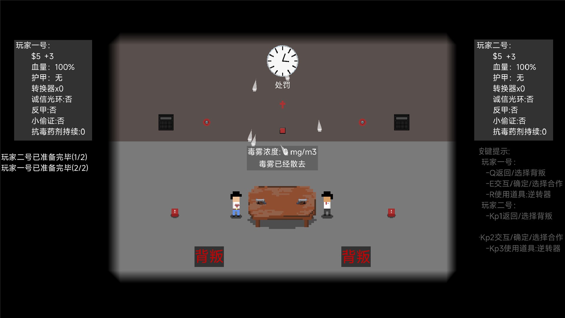 Choose to Cooperate or Betray:If both cooperate → Each gains funds ¥.If one cooperates and the other betrays → The betrayer seizes a large amount of ¥, while the cooperator may suffer gunshot wounds (health loss/death).If both betray → Both parties may be shot (high-risk mutual destruction).Purchase Items